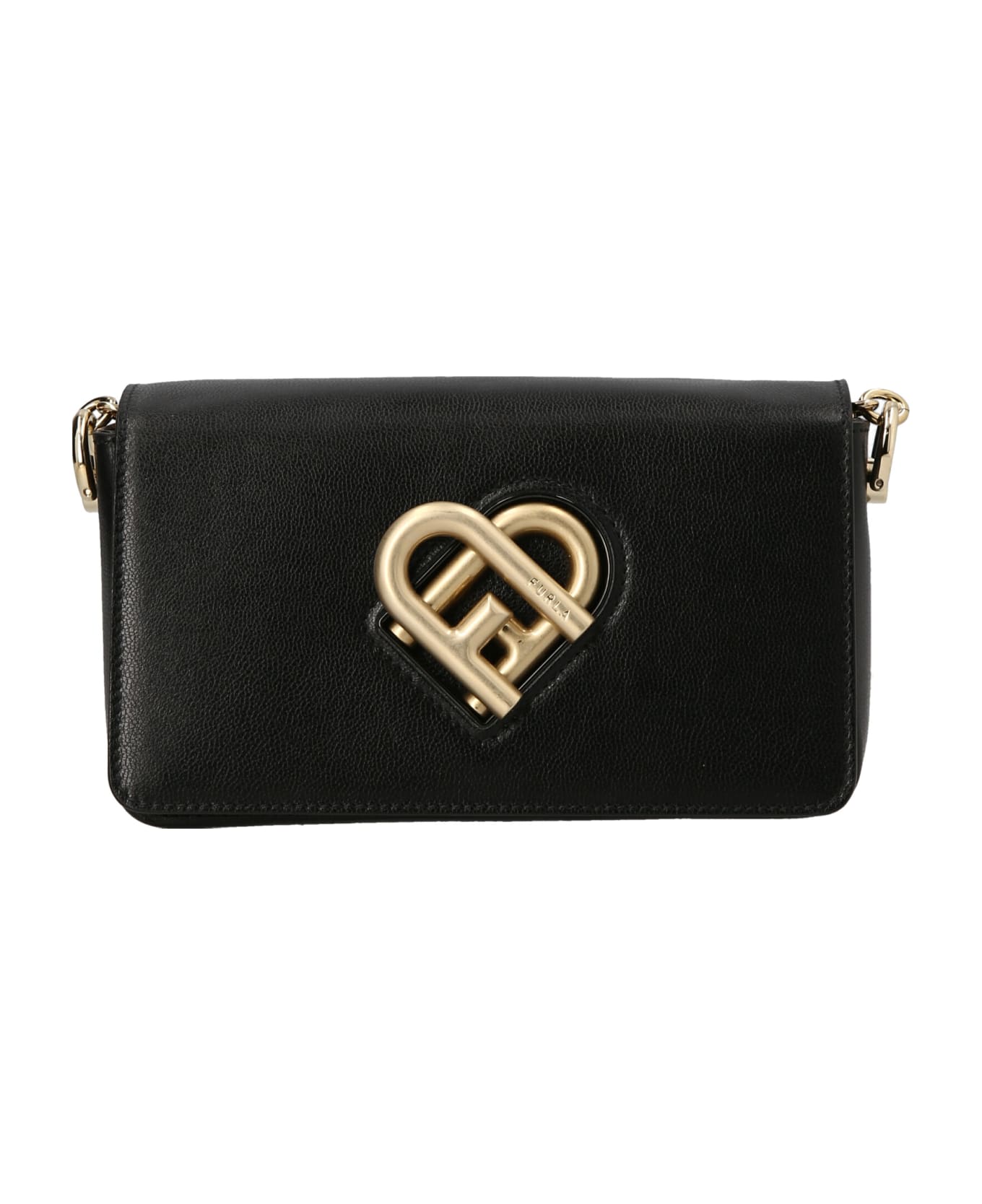 'My Joy Mini' crossbody bag in Taita calf leather with turn lock closure with heart-shaped crossed logos, fixed metal and leather chain shoulder strap, and inner pocket.