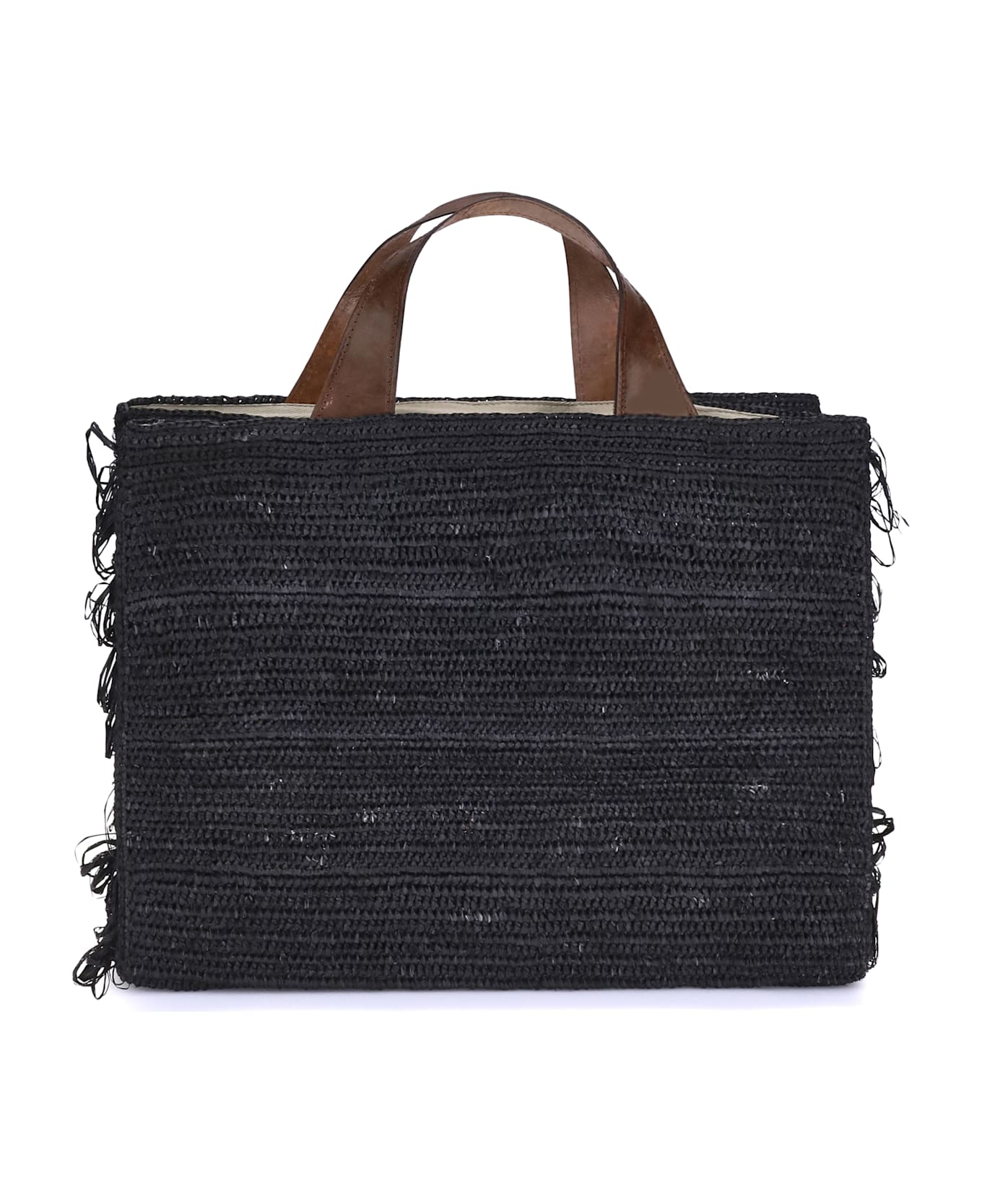 Onja raffia tote bag by ibeliv, perfect for natural, handcrafted elegance. featuring two leather handles at the top, it has a magnetic button closure and a large interior compartment. inside, an attached welt pocket provides extra space for essentials. the crochet design on the front and back panels enhances the craftsmanship, while the side panels are embellished with applique bangs that add movement and boho-chic style.