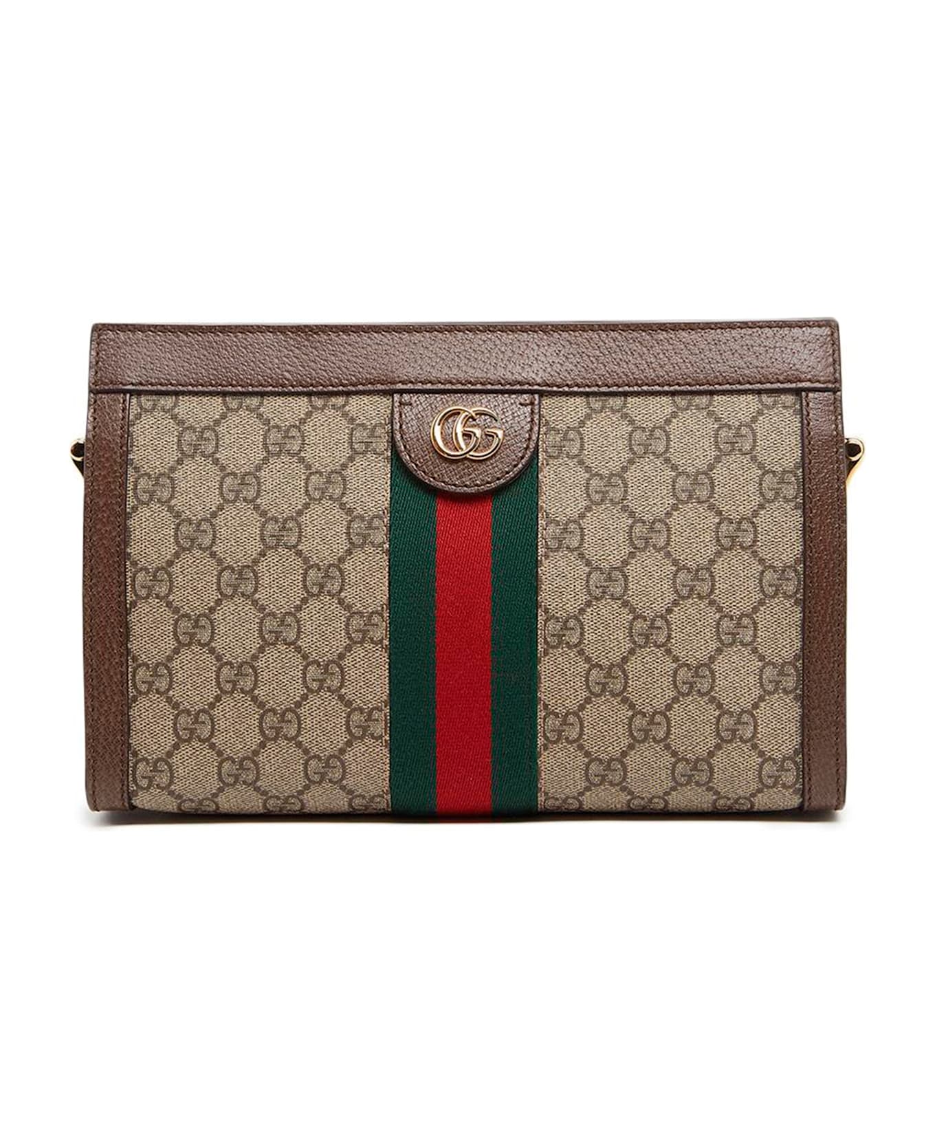 Ophidia GG small shoulder bag in beige and ebony GG Supreme fabric, brown leather details, green and red Web detail, gold metal details, chain shoulder strap, and magnetic closure. Composition: