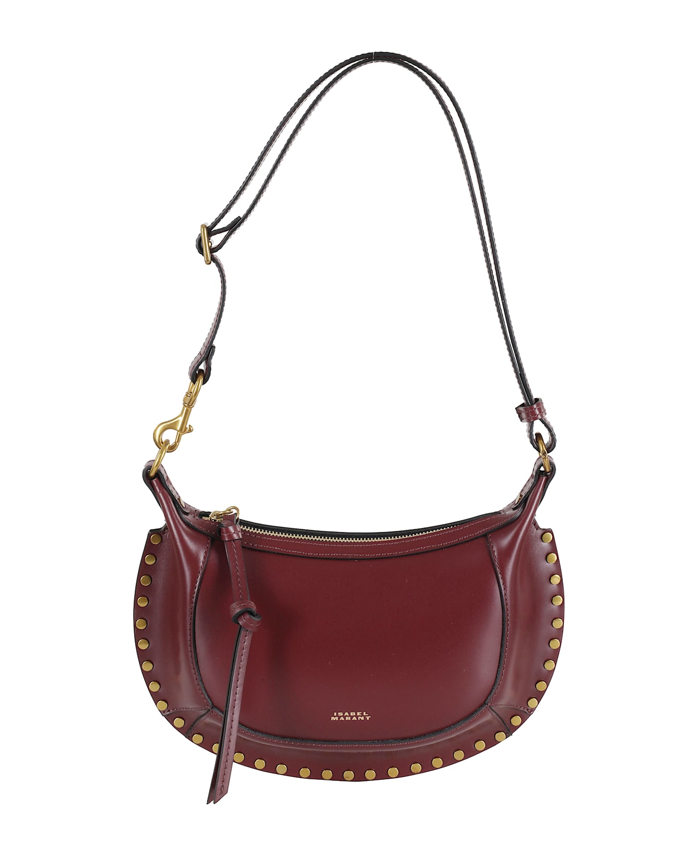 Category: Handbags Item: Oskan moon Brand: Isabel Marant Color: Burgundy Details: Border adorned with metal studs, adjustable shoulder strap with buckle Closure: Zipper with long knotted leather slider SIZE & FIT Height: 18 cm Width: 28. 5 cm Depth: 9 cm