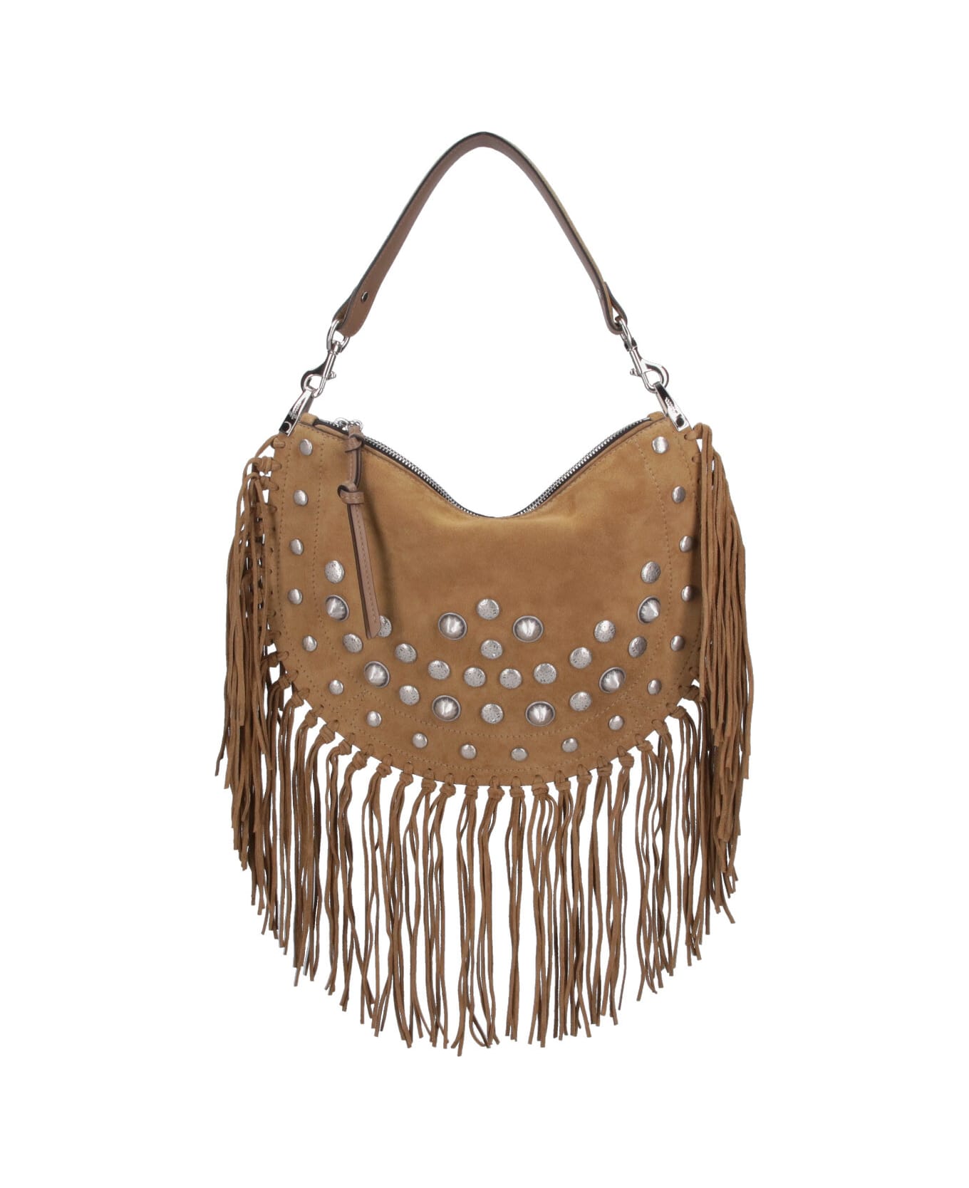 Isabel Marant 'Oskan Soft' fringed shoulder bag in brown suede, removable handle, removable shoulder strap, zip closure, leather knotted maxi zipper detail, silver metal studs on the front, embossed logo on the front, inner slip pocket, main inner compartment, maxi suede fringes on the bottom.