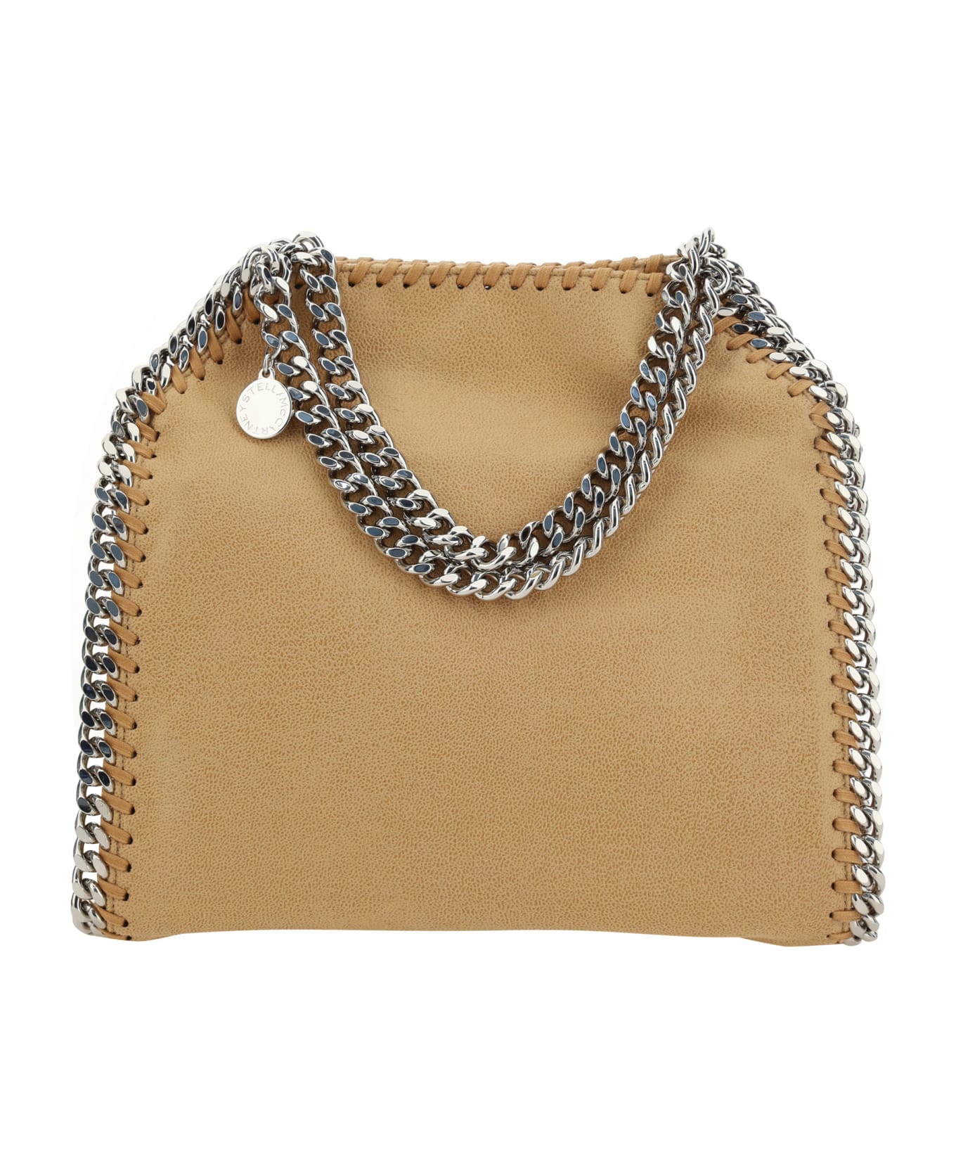 Palladium tote handbag by stella mccartney, silver-plated chain trim and top strap, suede-effect faux leather design, soft design, single interior compartment, iconic branded signature metal charm applied to base of shoulder strap.