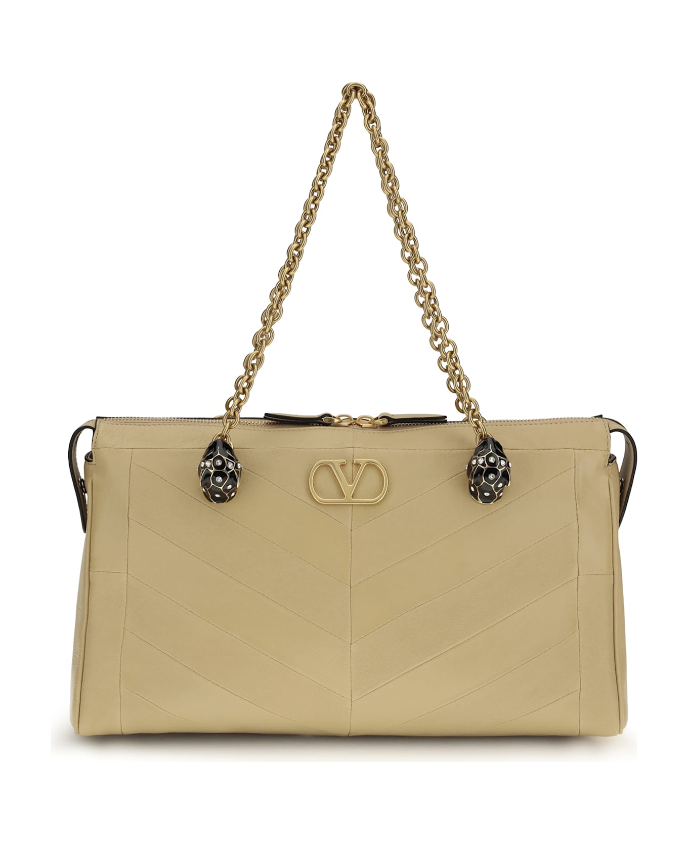 The panthea chevron shoulder bag by valentino garavani combines elegance and character in a sophisticated design. embellished with antique gold-finish metal details and an antique brass vlogo signature element, it features a zip closure and side buttons. the nappa leather lining includes a flat pocket and a zip pocket, while the chain handles and adjustable, removable studded leather shoulder strap make this bag versatile and distinctive.