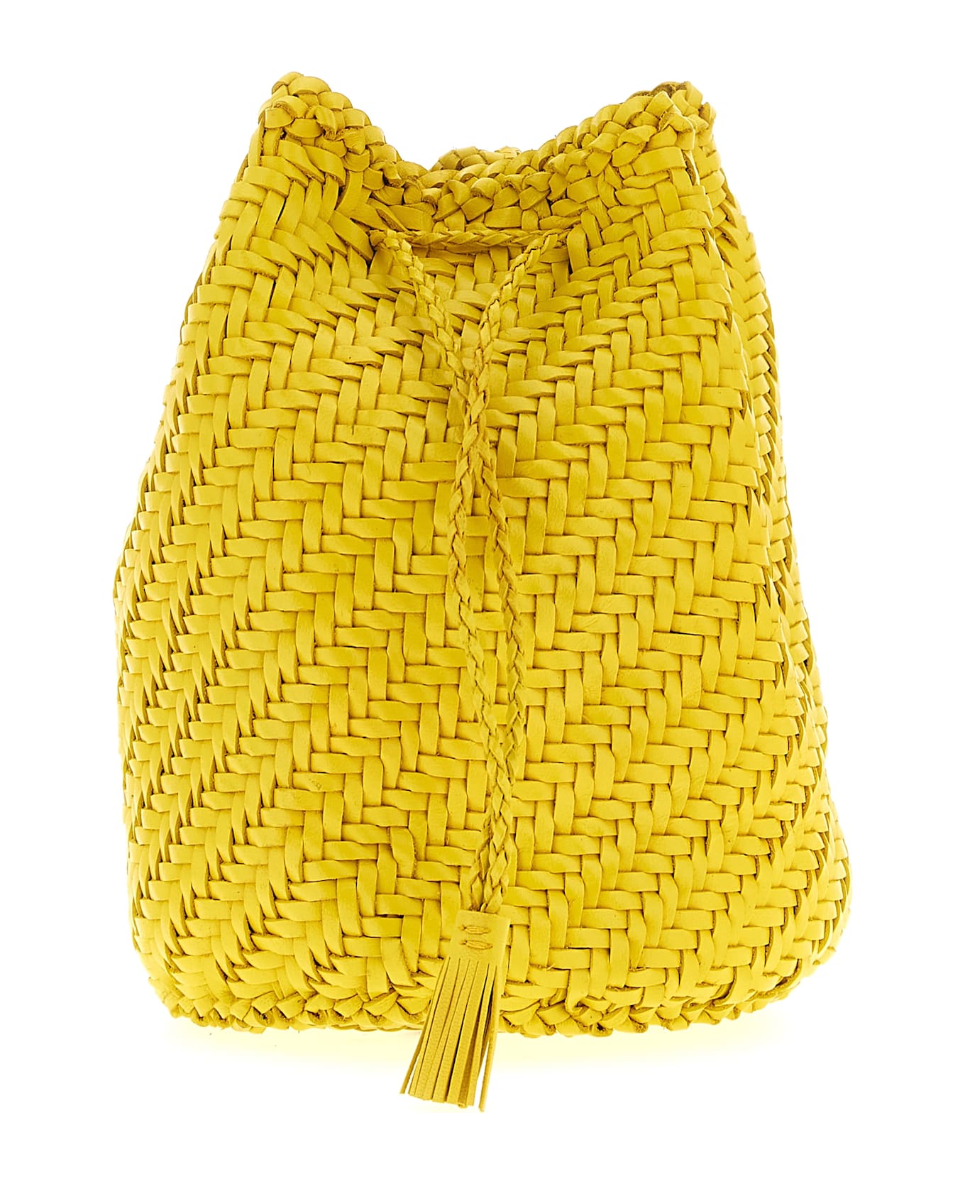 'Pompom Double Jump' bucket bag in hand-woven buffalo leather characterized by basket weaving with tightly knit weave, unlined, drawstring closure, shoulder strap. An antiqued St. Christopher medal-shaped pendant, in homage to the patron saint of travelers, is hand-sewn inside each bag Dragon Diffusion the brand's seal of authenticity.