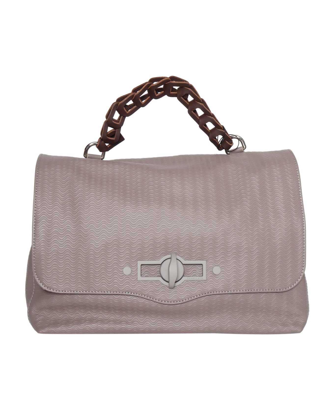 Wavy motif leather bag, handmade, removable and extendable shoulder strap, double lock with twist lock, top handle in leather chain Colour: London Grey 35,5 x 24 x 17 cm