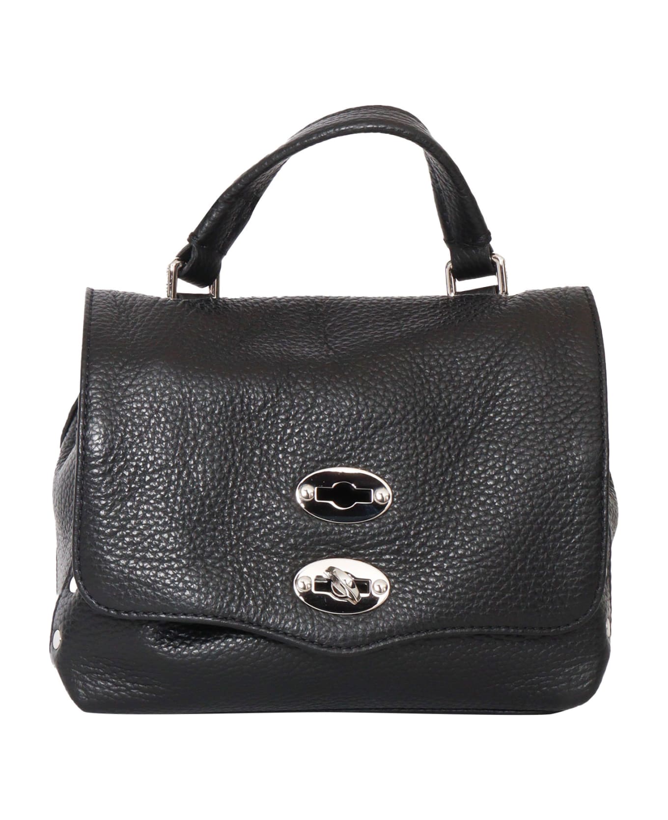 Postina Daily baby black in calfskin with handle, shoulder strap, flap closure with metal clip.