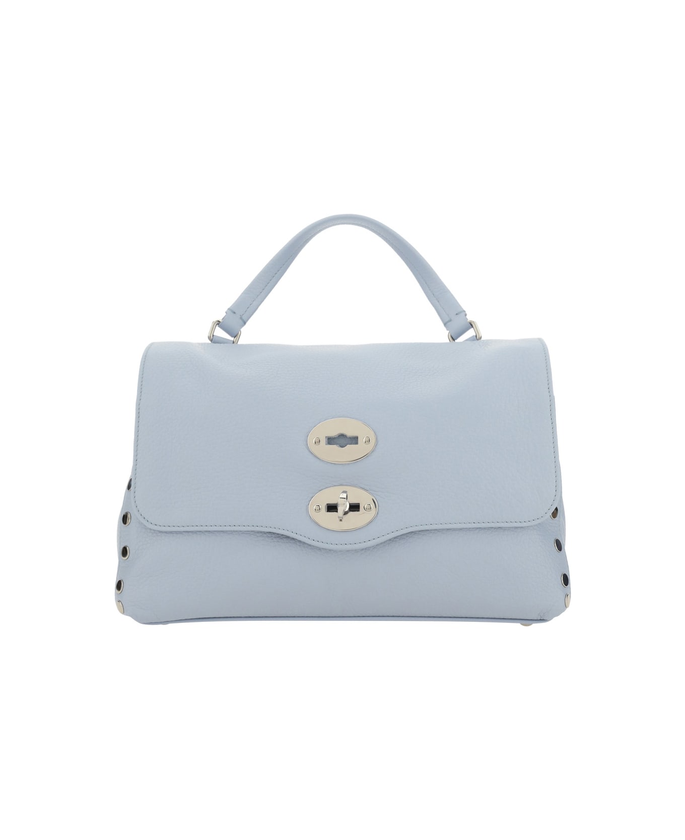 Calfskin daily postina bag by zanellato, single flat leather top handle, front hook-and-loop closure, adjustable and removable shoulder strap, flat studs on side panels, two interior compartments with welt pocket.