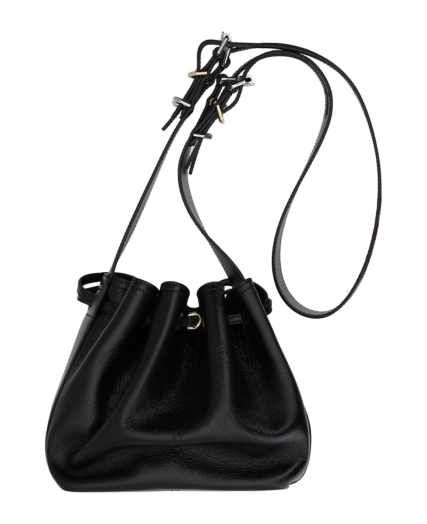 Givenchy's pumpkin bucket bag is made of tumbled leather and features a sophisticated, modern design. the top drawstring closure allows for easy adjustment, keeping items secure. the long, adjustable shoulder strap with four buckles offers versatility and comfort, allowing it to be adjusted to your desired length. on the front, givenchy's iconic monogram is press-stamped, giving it a distinctive and recognizable touch. inside, the bag features a single main compartment, perfect for practical and functional daily use.
