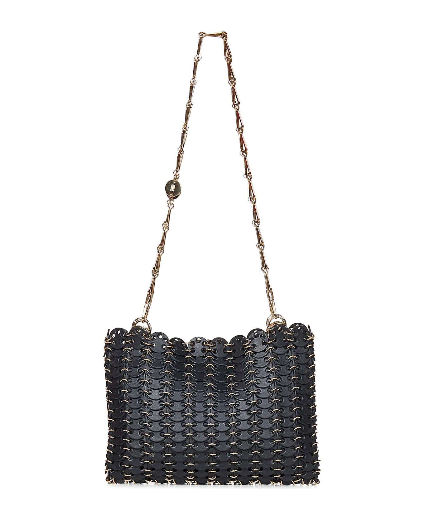 Composition: Magnetic Closure Detachable Gold-toned Metal Double Chain Shoulder Strap With Engraved Rabanne Logo Discs Interior: One Main Compartment Made Of Black Calf Leather Discs Held Together By Gold-toned Metal Rings Color: Black/gold 80% Calf Leather, 20% Steel Made In Madagascar