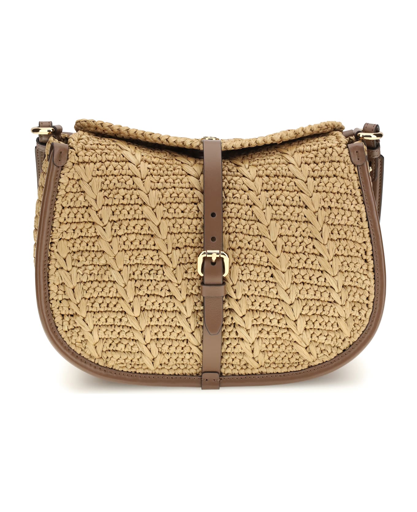 The pony shoulder bag in crochet raffia by etro expresses refined boho elegance. featuring a double closure, it features a magnetic button decorated with the pegasus metal coin and a secondary closure with a functional buckle. the model includes interchangeable handle and shoulder strap for hand, shoulder or crossbody carry, enhanced by paisley detail on the snap hooks. a practical interior wall pocket completes the design.