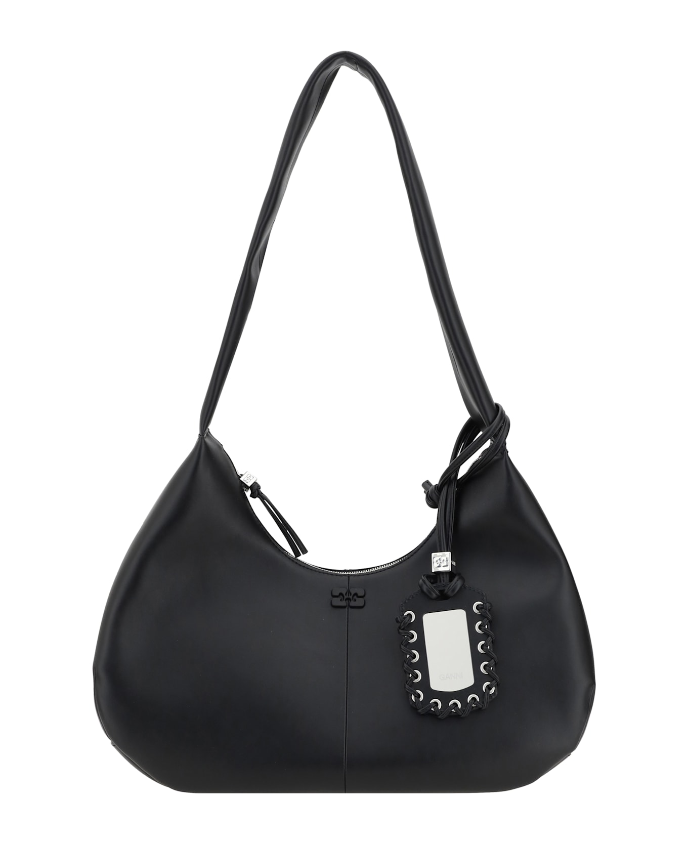 Ganni's recycled leather shoulder bag is made from super soft and flexible leather, offering a sustainable and refined design. it has a top shoulder strap for comfortable carrying and a top zipper closure to keep items secure. an applied mirror detail on the top handle adds a distinctive touch. inside, it features a single compartment for easy and functional handling. Composition: 65% % Calf Leather Bos Taurus, 19% % Polyurethane, 16% % Polyester