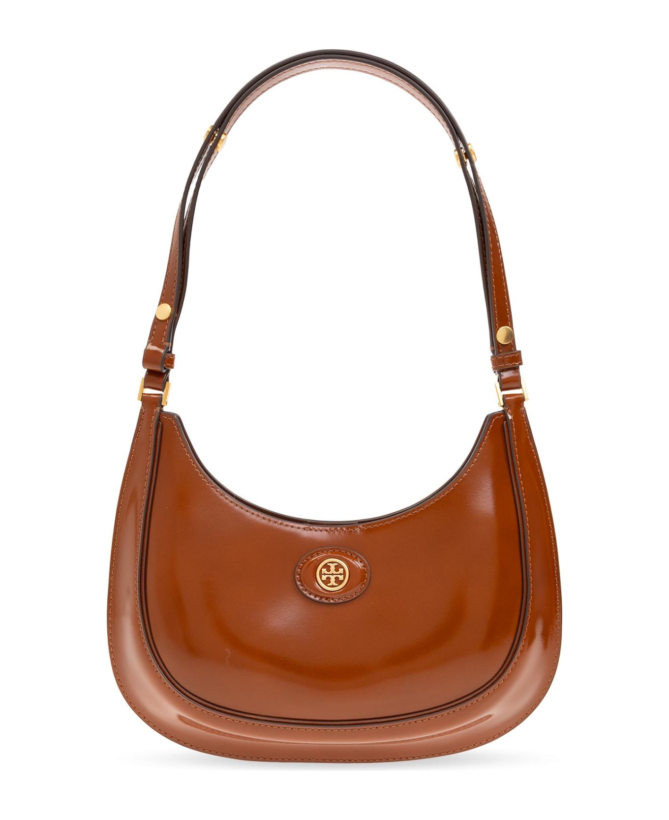 Brown 'Robinson' shoulder bag from Tory Burch. Made of cow leather, this model features a logo detail, half-round shoulder strap, gold-tone metal hardware and one internal compartment with one slip pocket.