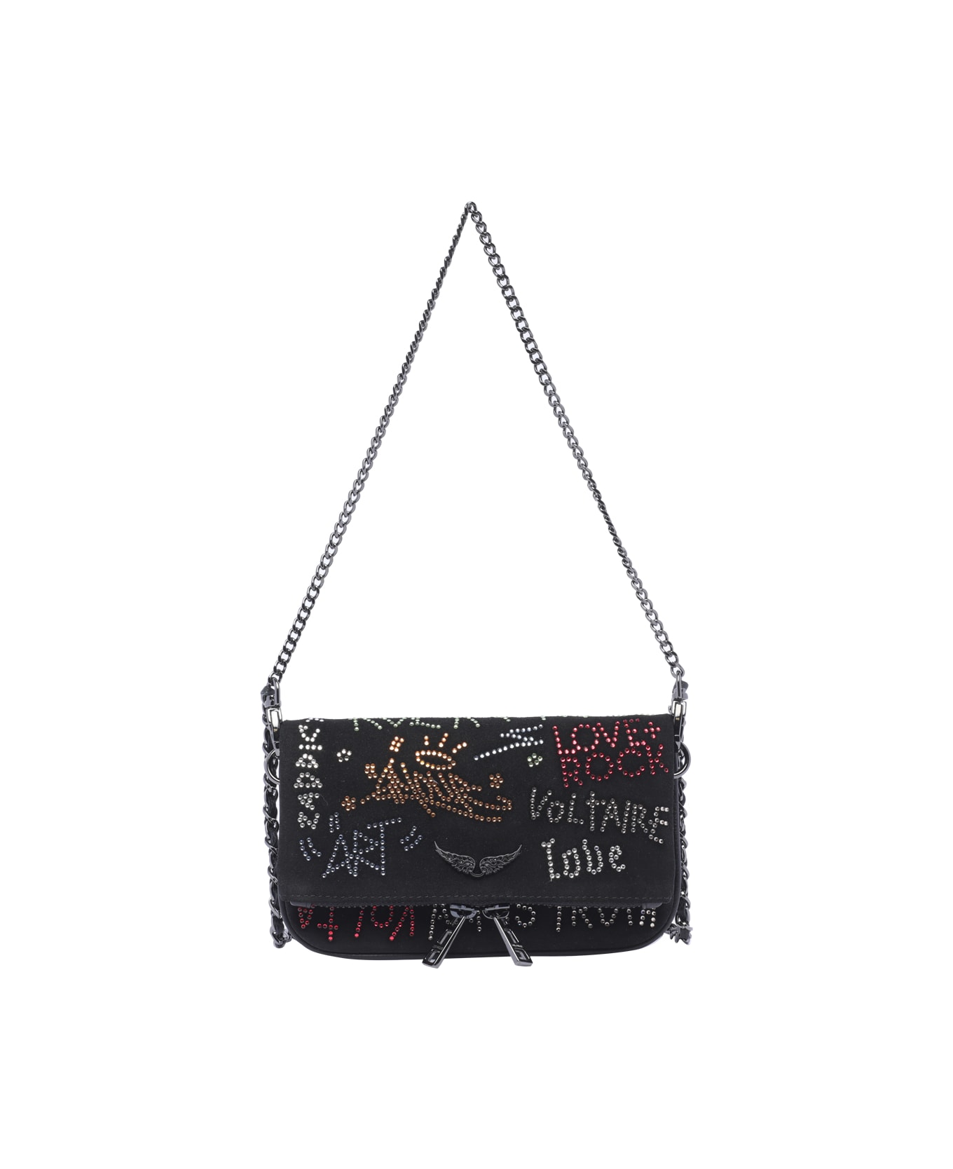 Zadig&Voltaire black Rock Nano Tag Strass, zip and magnetic closure, inner open pocket, external zipped pocket, removable strap, graffiti all over Composition: 100% Calf Leather