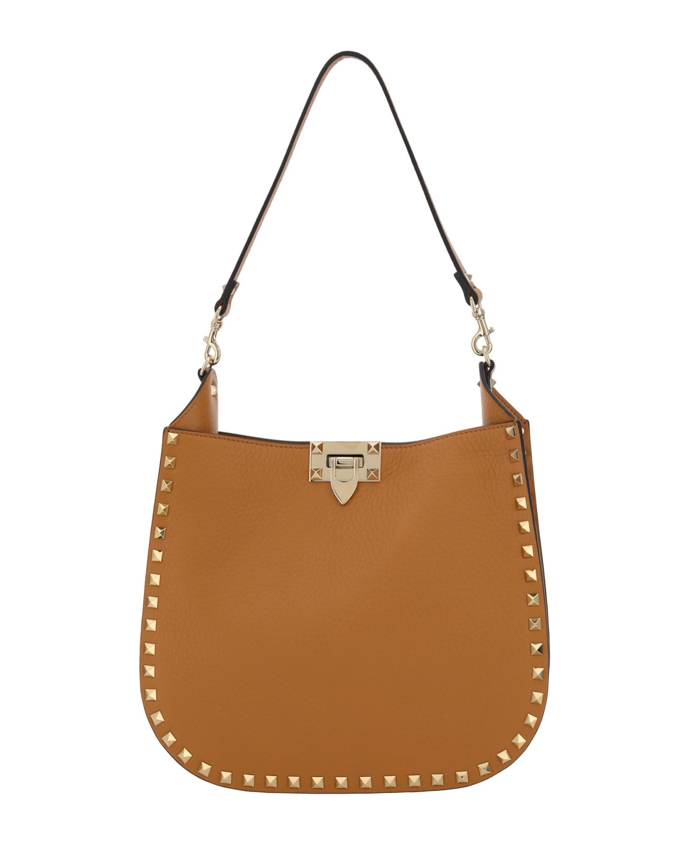Calfskin rockstud shoulder bag by valentino garavani, flat handle for carrying it on the shoulder, matching removable and adjustable webing shoulder strap, front closure using a swivel system, one interior welt pocket, iconic brand studs applied tone-on-tone to the bag's profiles, rigid design. Composition: 100% % Calf Leather Bos Taurus