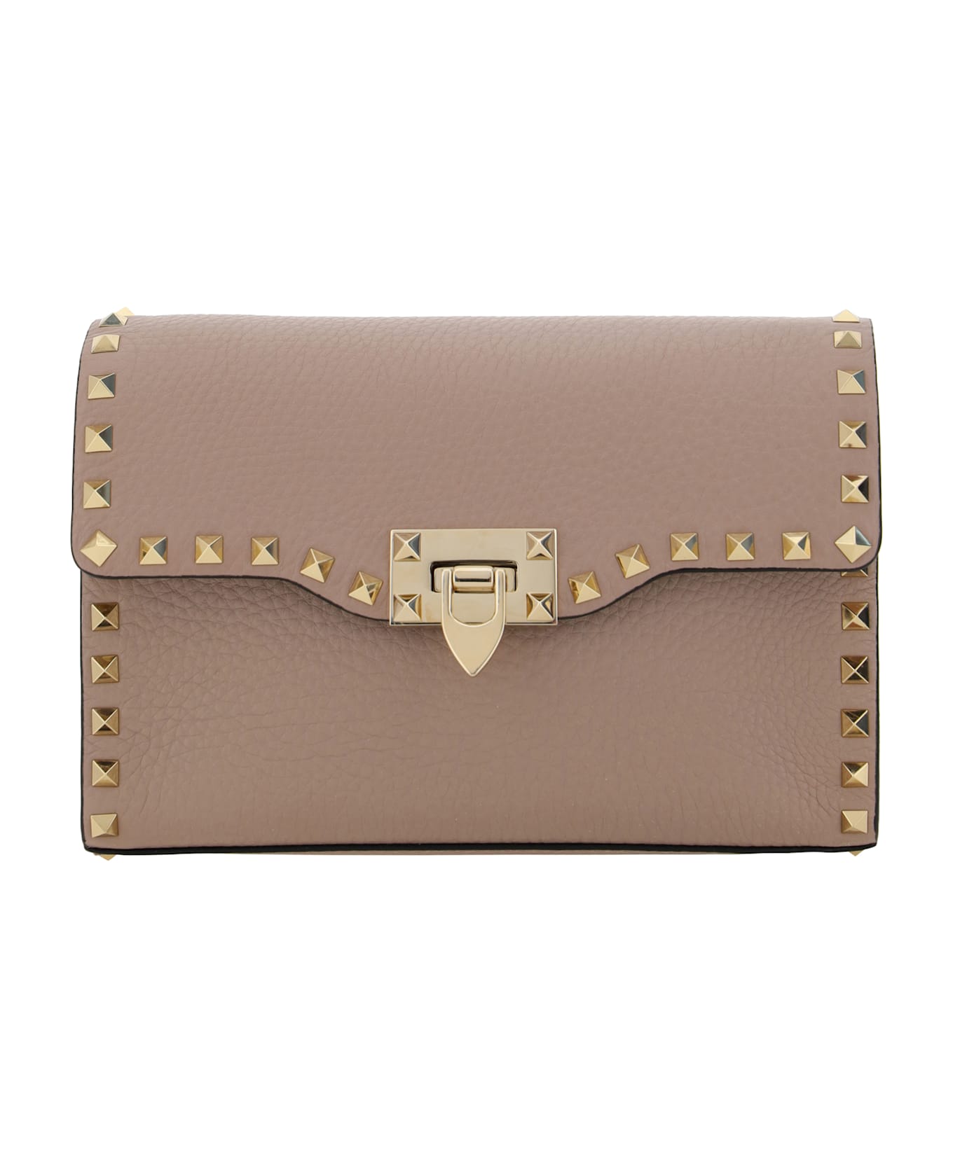 Valentino garavani's rockstud small leather shoulder bag is a sophisticated accessory with a grained leather design. the edging is embellished with the iconic rockstud studs, applied on the front and back. the front closure features a swivel, while the back features the brand's contrasting printed monogram. the shoulder strap combines leather and removable chain, offering versatility and style. a perfect balance between elegance and boldness.