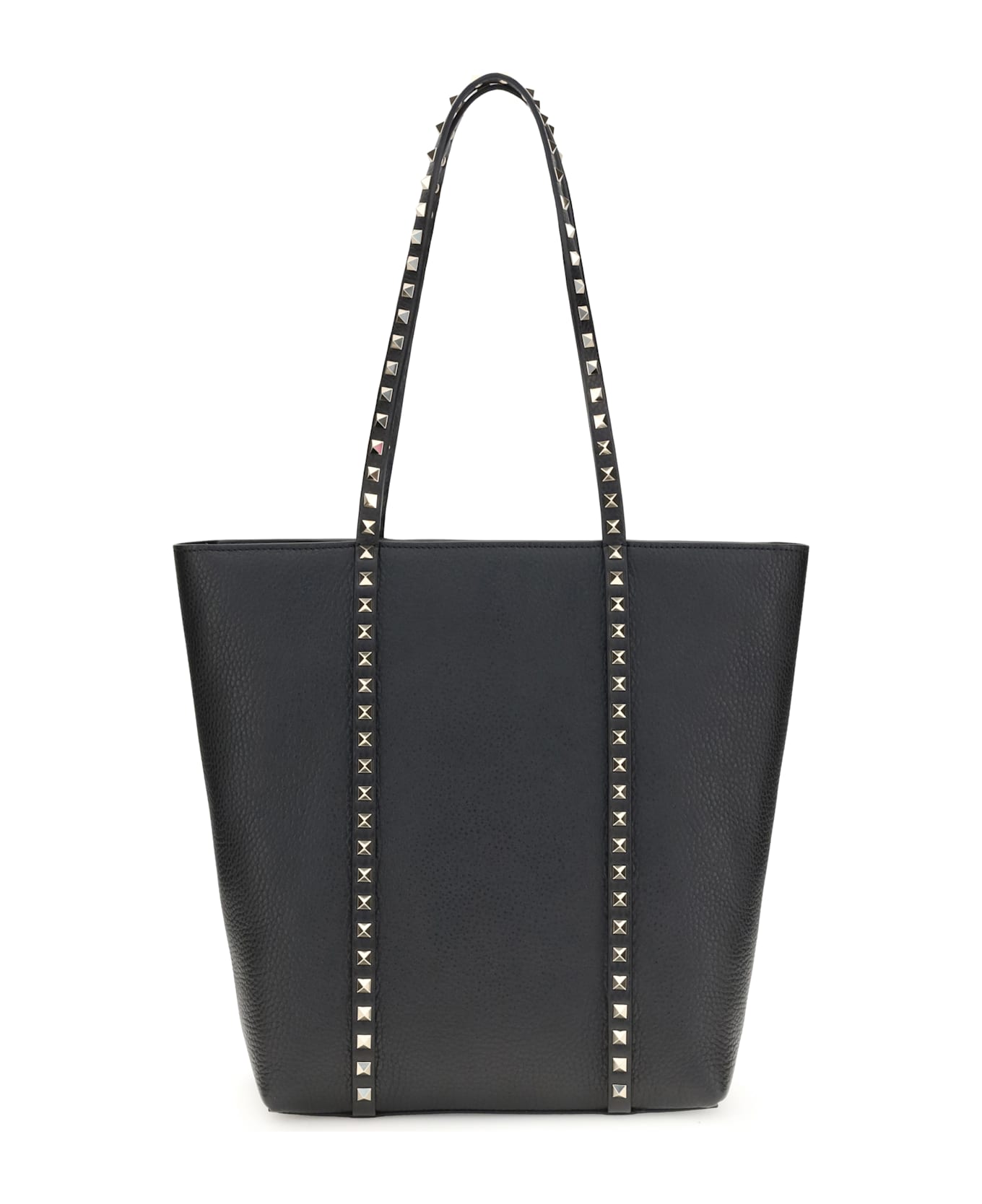 Valentino garavani's rockstud tote bag embodies the brand's bold elegance. crafted in fine grained calfskin leather, it is embellished with the iconic platinum-finish studs that define its bold character. featuring a zipper closure and protective feet at the base, it includes a removable internal pouch, perfect for organizing essentials with style and practicality. a sophisticated and distinctive accessory, ideal for any occasion.