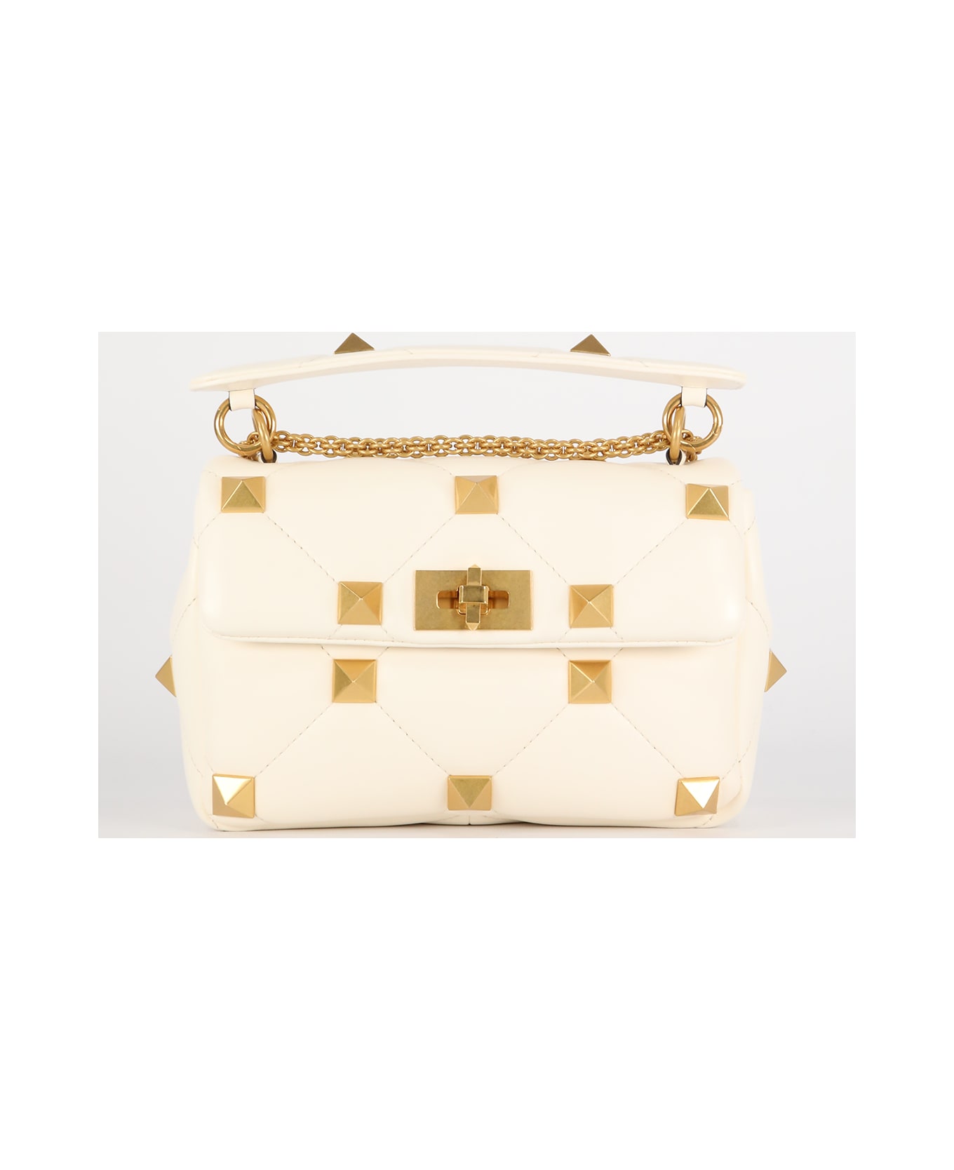 Medium Roman Stud The Shoulder Bag in ivory lambskin nappa with chain. It features quilted construction, gold-tone maxi studs embellishment, twist-lock closure, removable sliding chain strap, one interior zip pocket, one interior flat pocket and antique brass finish. Dimensions: 16x25x10cm