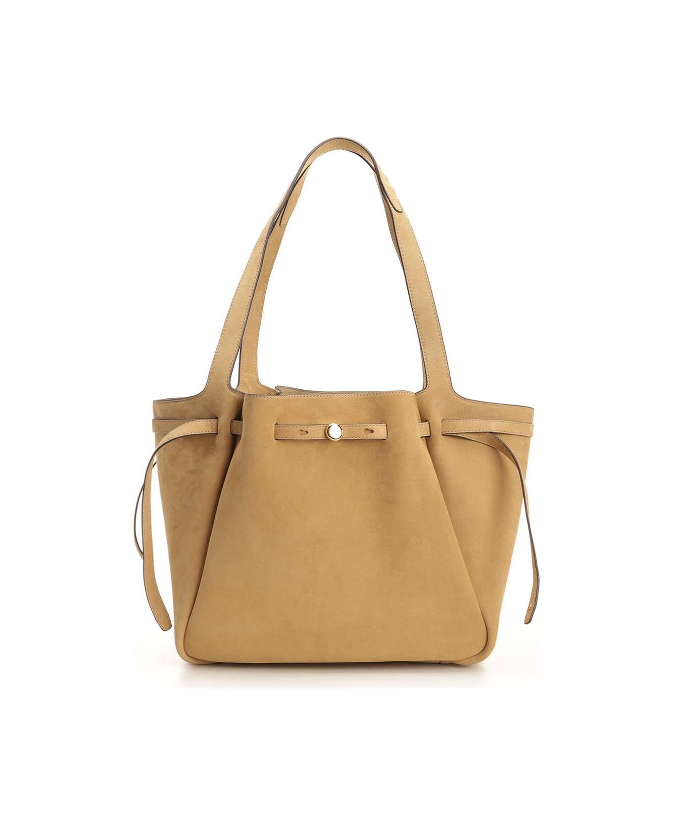 "Romy" tote bag from Tory Burch made of unlined honey beige nubuck, completed with internal pocket with zip closure and magnetic button closure.