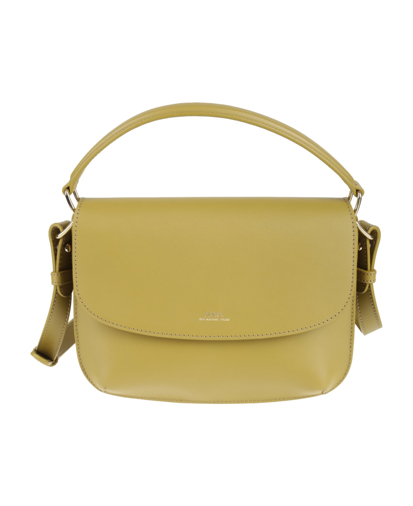 A. P. C. Olive green smooth vegetable-tanned leather bag with a magnetic flap closure. The adjustable strap allows the bag to be worn on the shoulder or chest, but can also be detached for carrying by hand using the designated handle. The corners are convex and rounded. The logo "APC Rue Madame Paris" is embossed in gold.