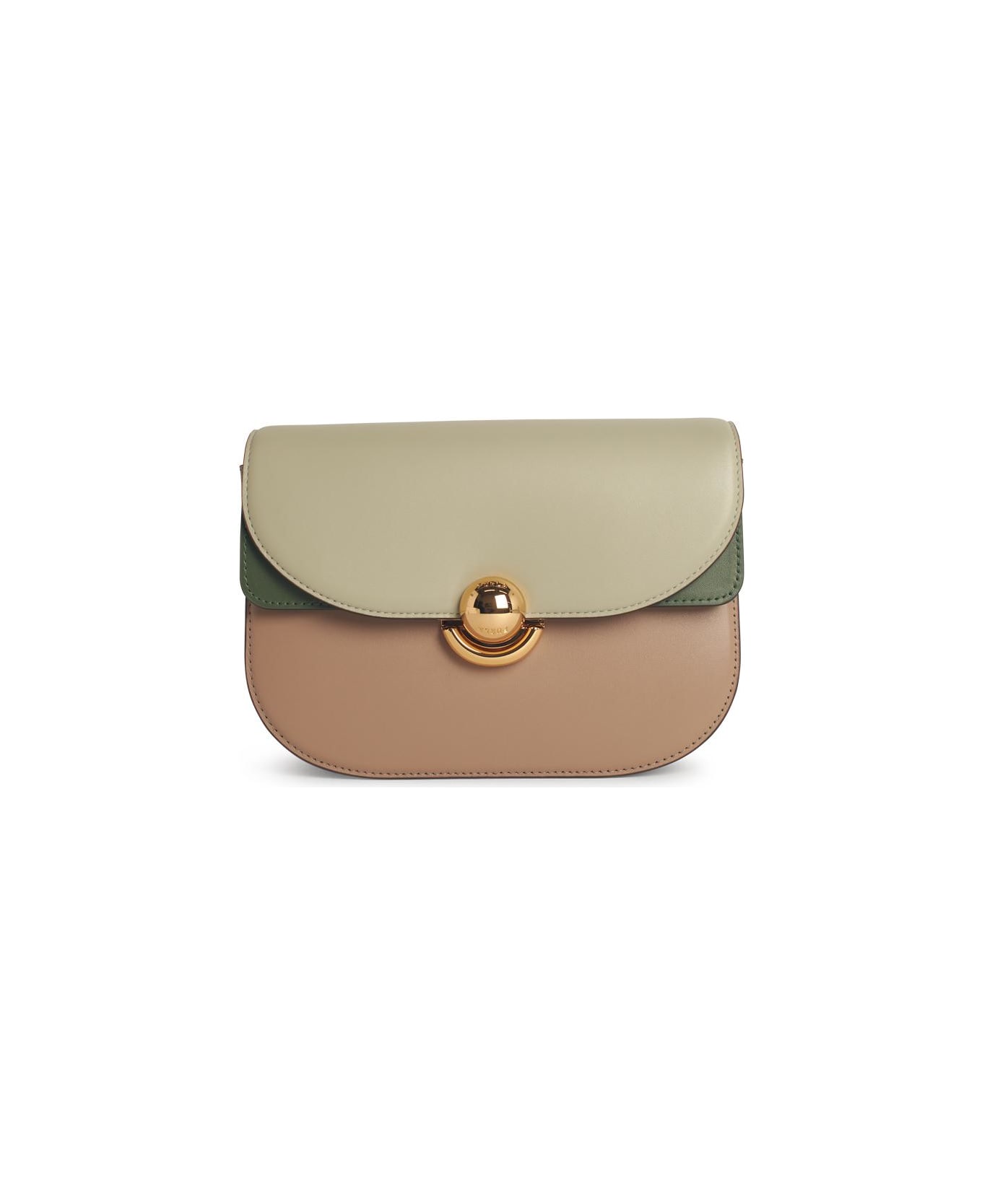 Adjustable and removable shoulder strap with logo pin buckle, top flap, iconic 'Sfera' closure, front flap pocket, inner zip pocket, inner pouch pocket\n24 x 15 x 7. 5 cm