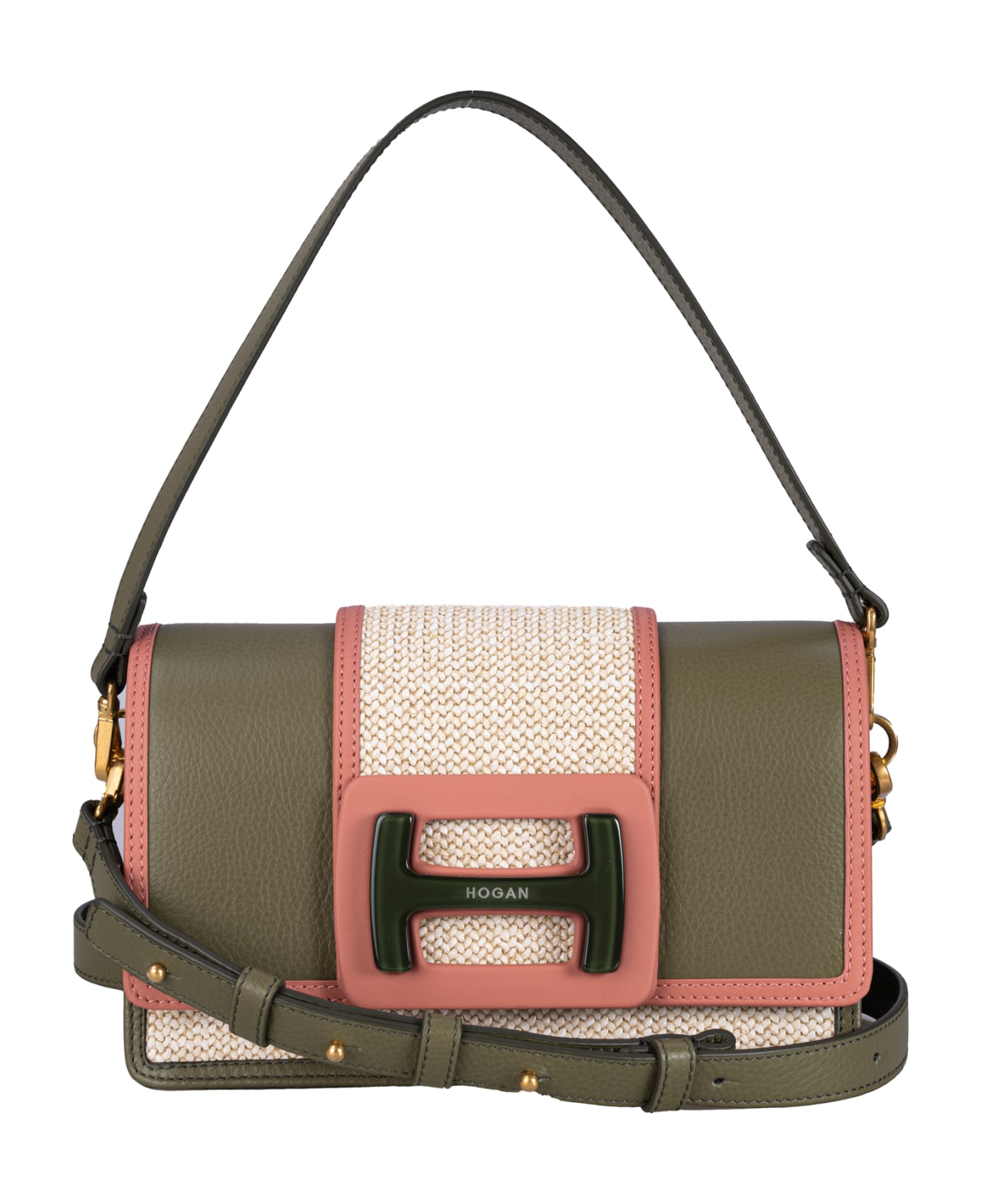 Hogan shoulder bag H-Bag Beige Pink Green. Women's shoulder bag. Item made in raffia. Leather inserts. H buckle with Hogan logo. Flap closure and magnetic button. Interior with two fabric compartments. Inside pocket. Dimensions: 23. 5 x 15 x 10. 5cm. Removable leather handle, adjustable and removable leather shoulder strap Care and maintenance instructions included. Fabric pouch included.