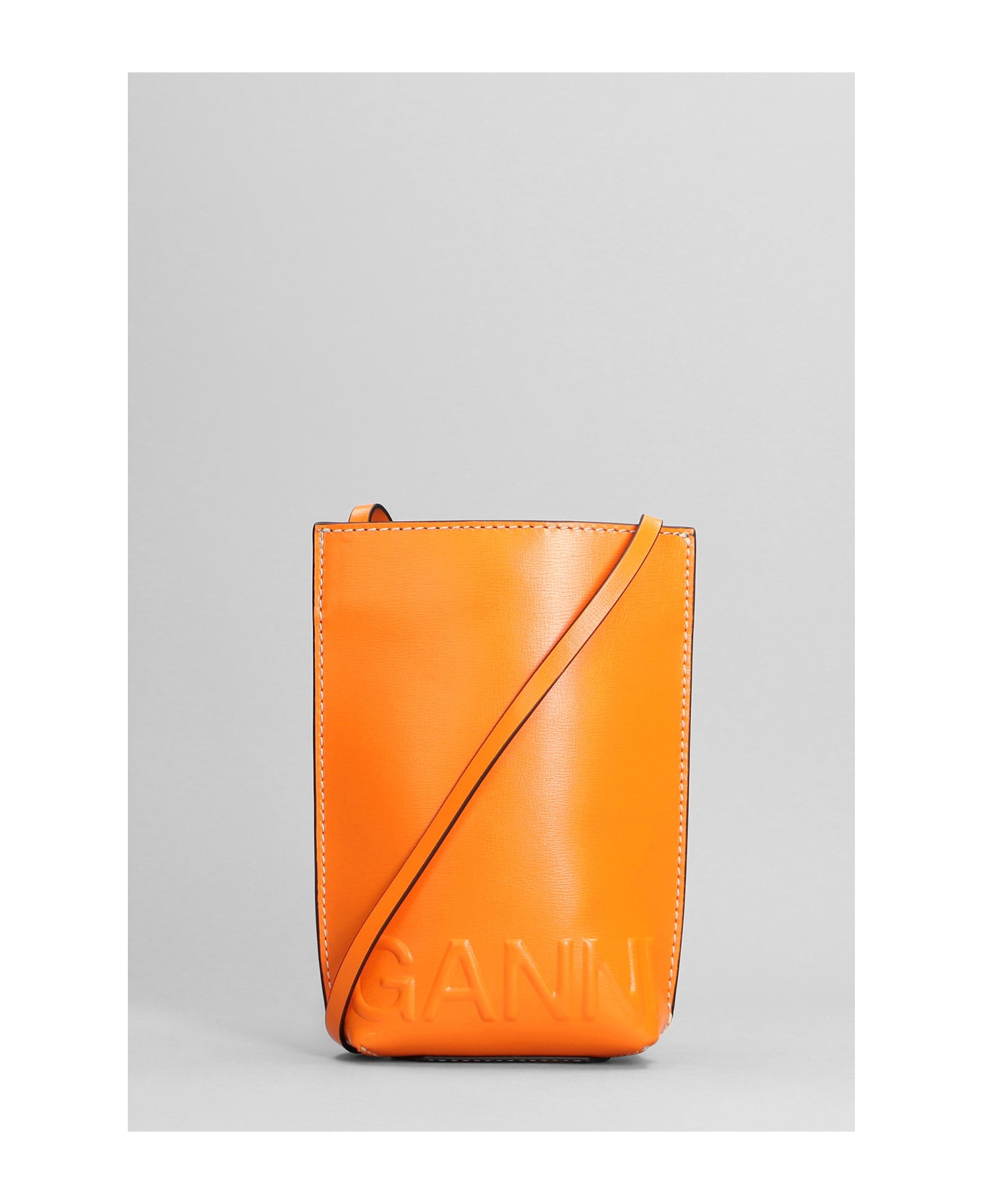 Shoulder bag in orange leather, 100% leather, relief logo, Made in China, shoulder strap, Height 195 mm, Width 130 mm