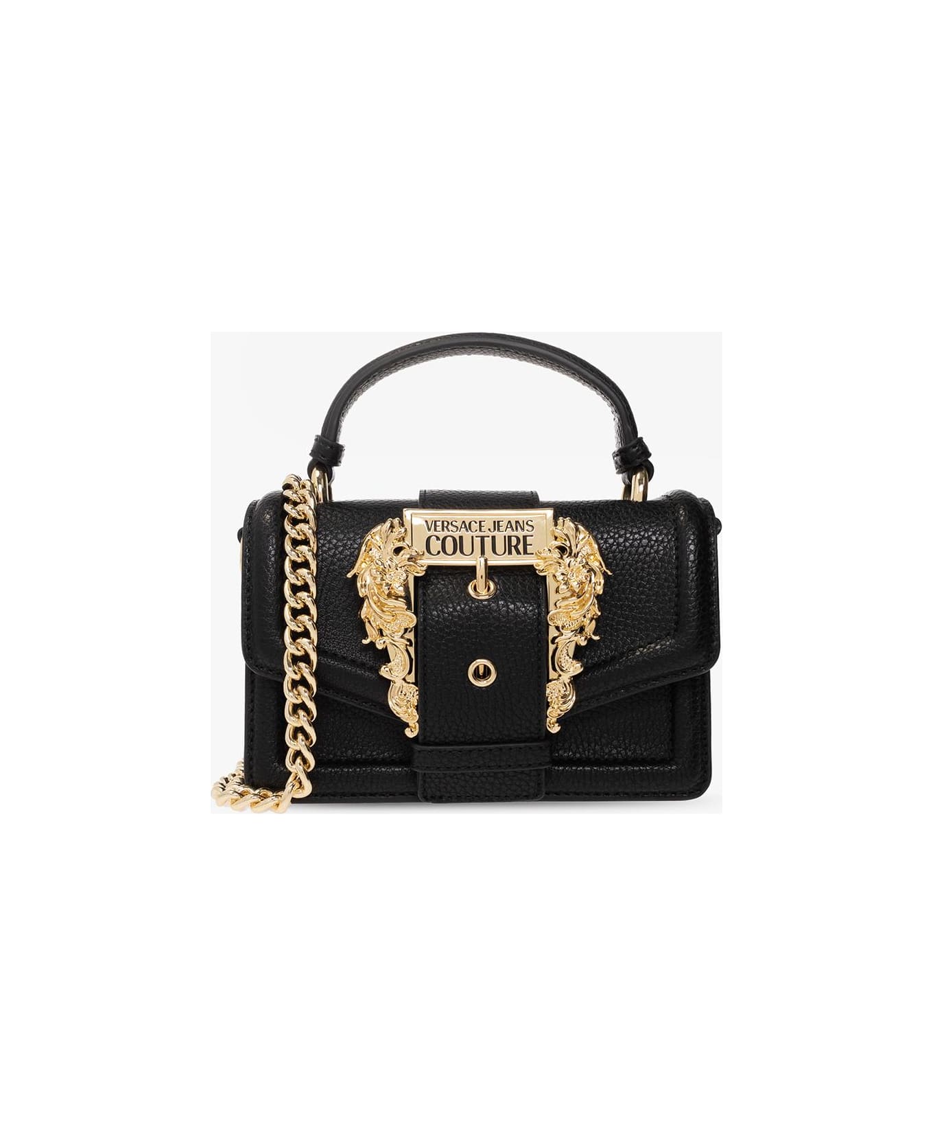Black shoulder bag from Versace Jeans Couture. Crafted from faux leather with a grain texture, this design secures with a snap and showcases the brand's signature baroque buckle on the flap, a half-round handle, a detachable chain strap trimmed with a fab