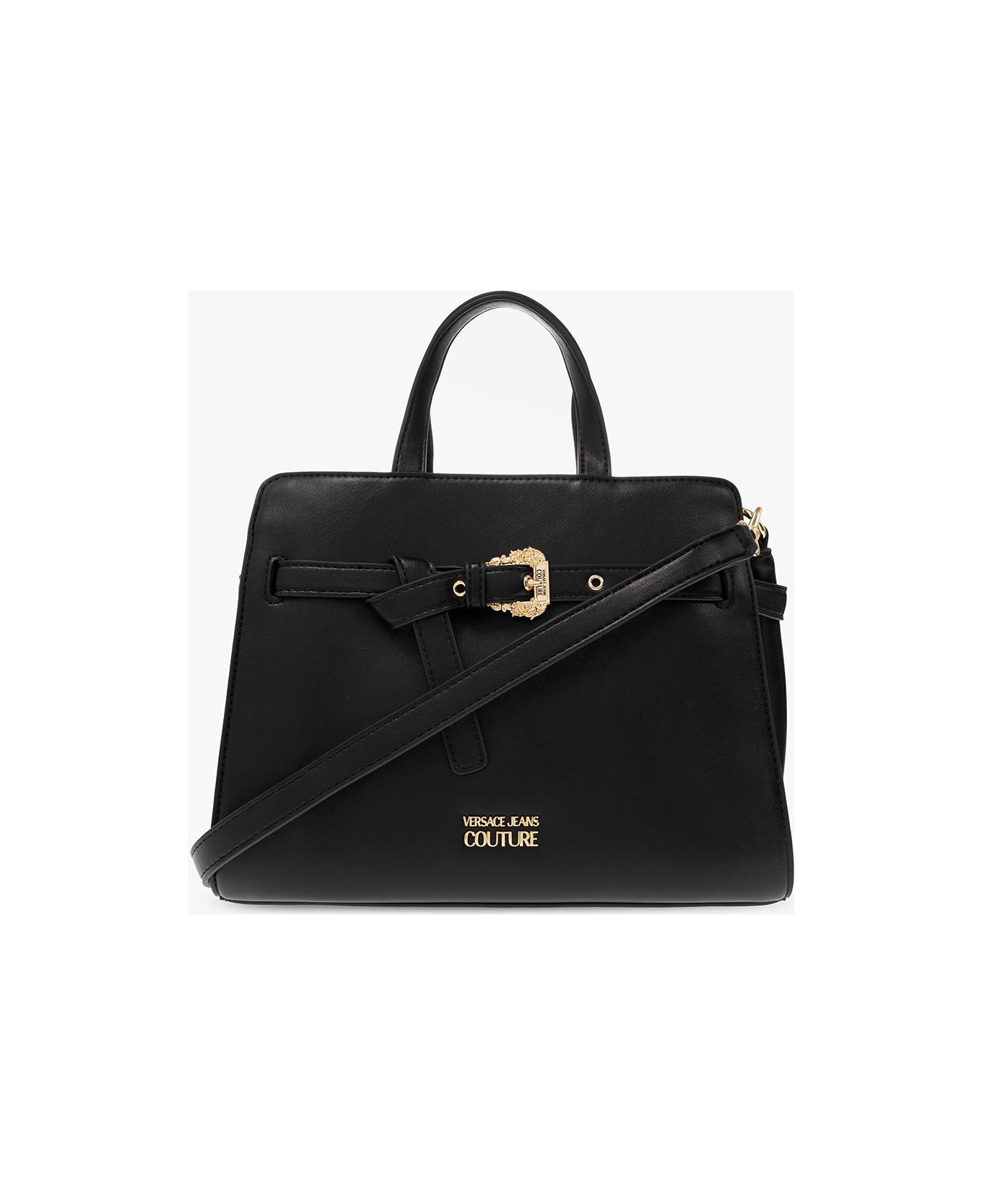 Black shoulder bag from Versace Jeans Couture. Crafted from faux leather, this design fastens with a zip and showcases a logo plaque and the brand's signature baroque buckle on the front. It is complete with a detachable and adjustable shoulder strap, two