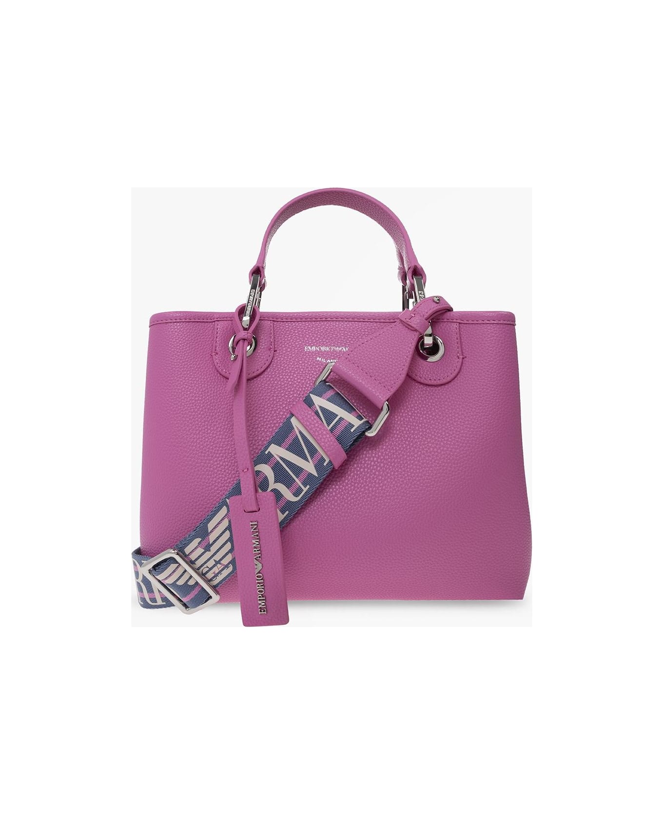 Pink shoulder bag from Emporio Armani. Made of faux leather, this design fastens with a magnetic snap and is enriched by a gold-tone logo logo print and detachable logo charm. It is complete with two half-round handles, detachable and adjustable strap in