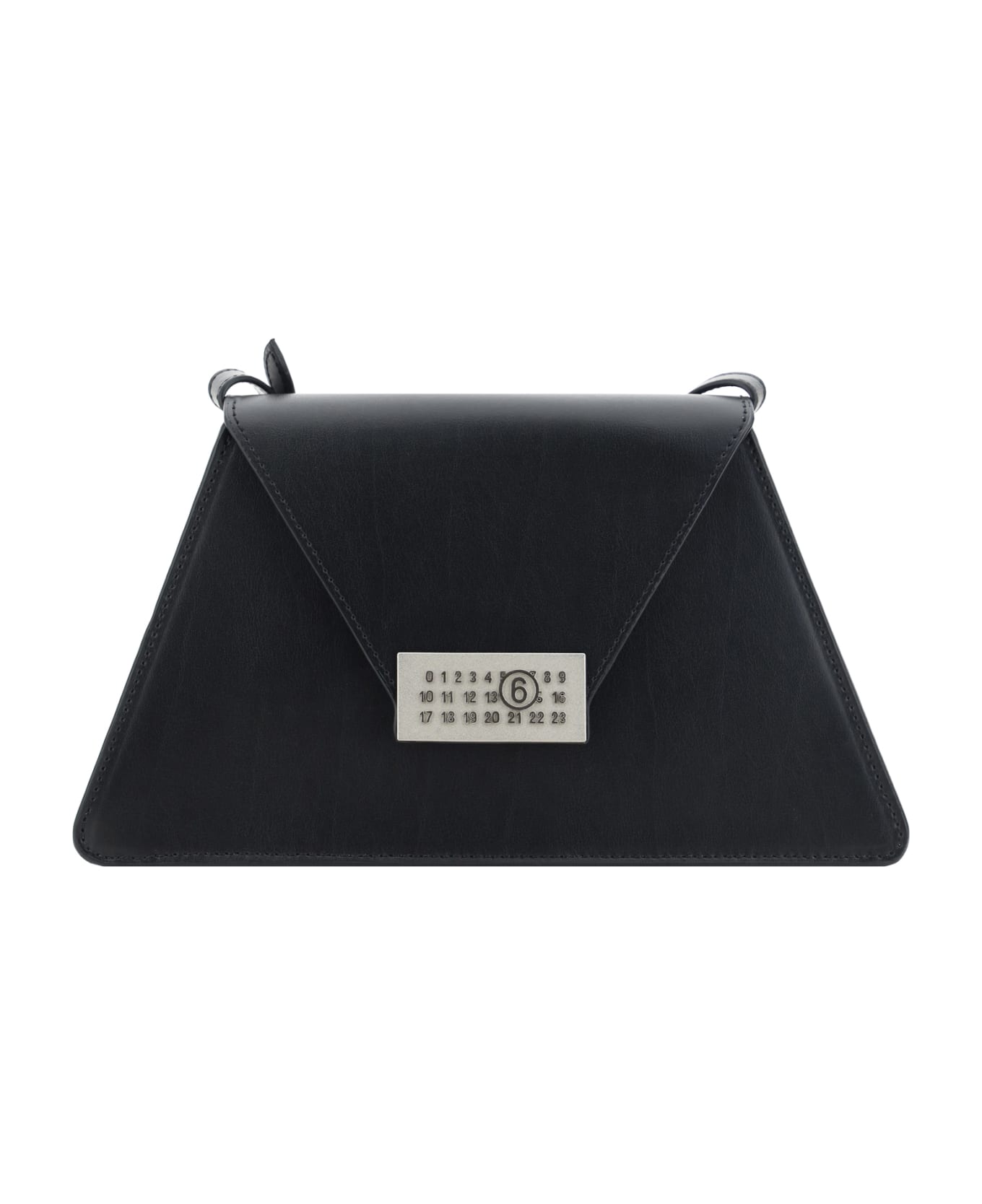 Calfiskin shoulder bag by mm6, geometric design, adjustable flat shoulder strap, front flap closure embellished with iconic brand logo.