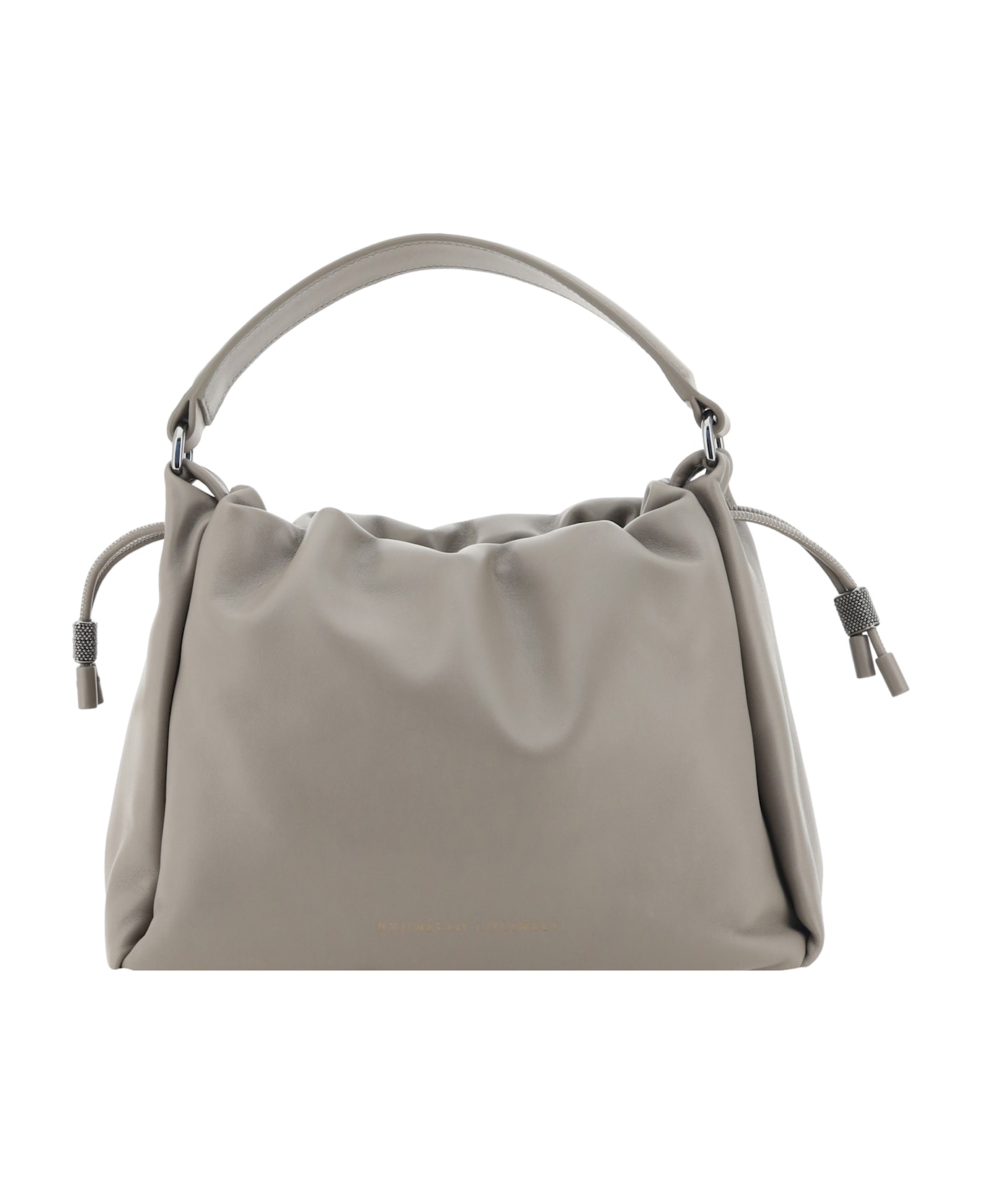 Brunello cucinelli's leather shoulder bag combines craftsmanship and functionality in an essential and refined design. featuring a flat top handle, drawstring closure and an adjustable, removable shoulder strap, it has a single interior compartment and the brand's iconic monogram press-stamped on the front.