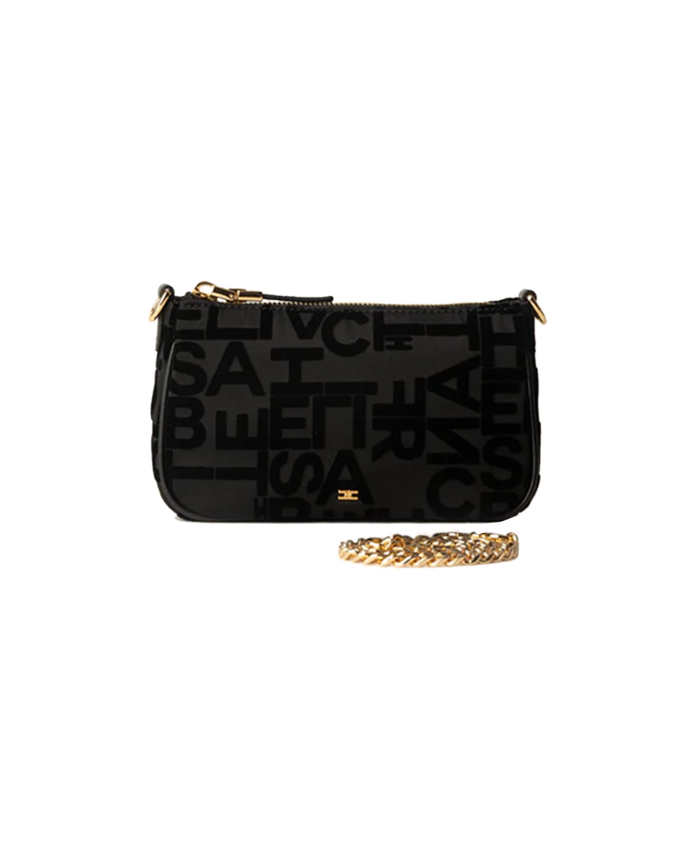 Mini clutch bag made of fabric embellished with a flock lettering pattern and a small gold shoulder strap