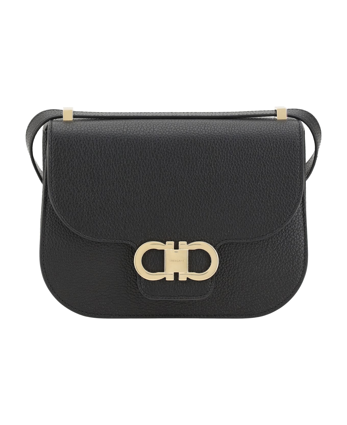 Ferragamo's leather shoulder bag with geometric lines and a looped shoulder strap is the perfect example of elegance and versatility. made of grained leather, it features a shaped front flap decorated with a double gancini in a gold finish, the brand's distinctive symbol. the front gusseted pocket, flat back pocket and slots in the central compartment provide ample space to store personal effects in an organized manner. a refined accessory, ideal for those seeking a touch of everyday luxury.