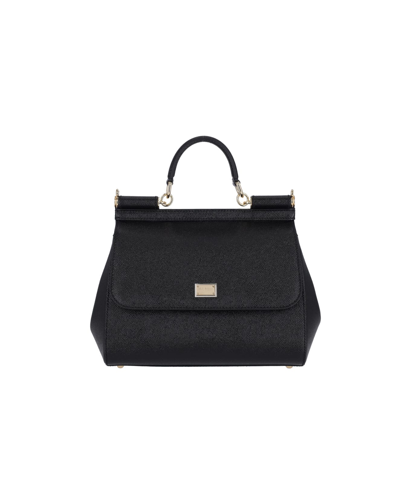 Dolce & Gabbana 'Sicily' large handbag in black calf leather with handle, adjustable and removable shoulder strap, interlocking flap closure, gold metal logo tag detail, inner slip pocket, inner zip pocket, main inner compartment, metal feet on the bottom. Composition: 100% Calf Leather