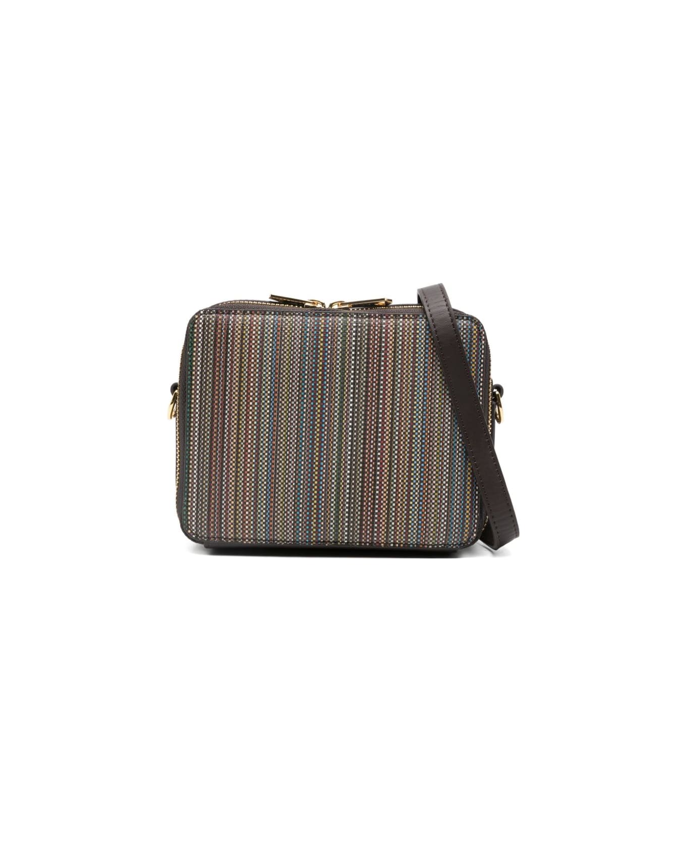 brown multicolored striped pattern zip fastening leather trim detachable shoulder strap rectangular shape