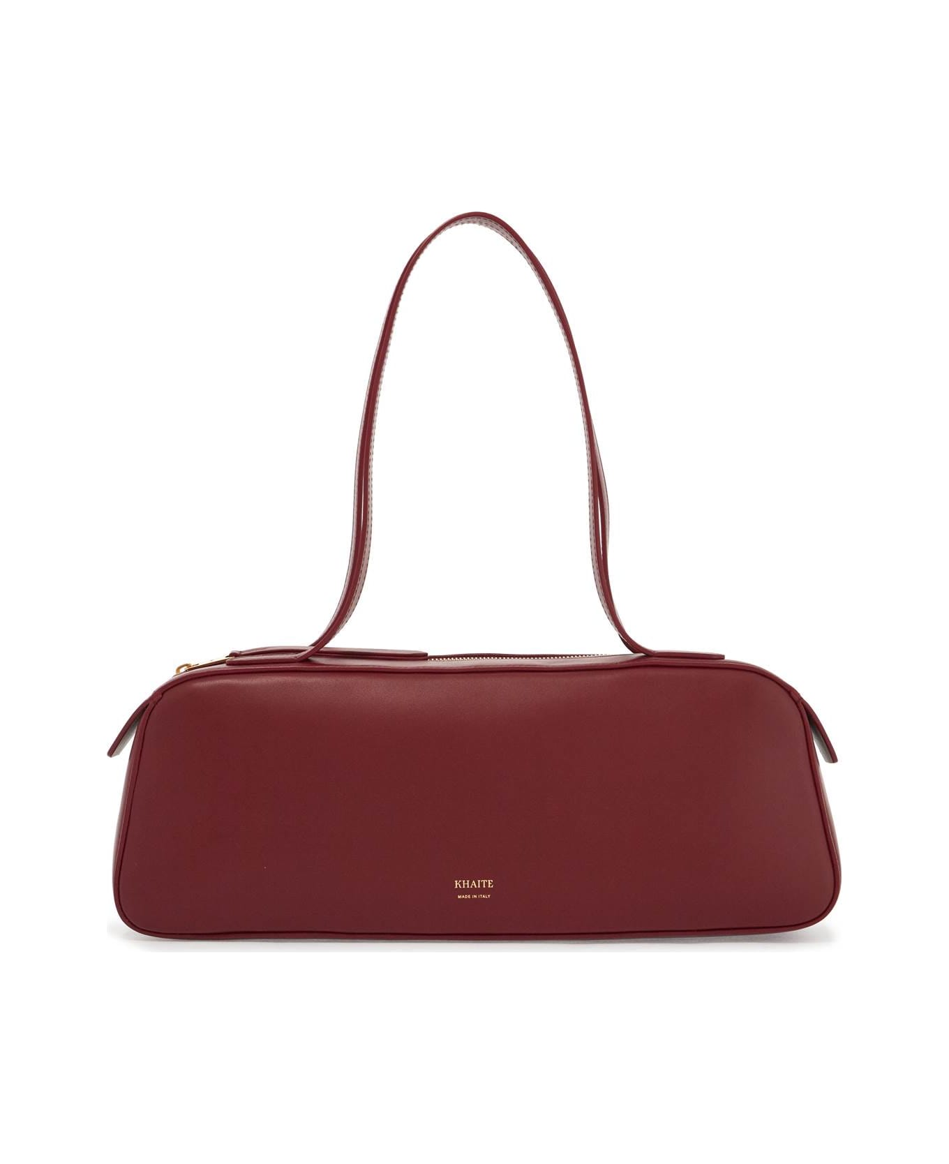 The Simona shoulder bag by Khaite is made of smooth leather and features a refined and elongated silhouette. It has a top zip closure with a leather pull, a suede microfiber interior, and double top handles. The design is enhanced by a laminated lettering logo on the front. Composition: 100% calfskin