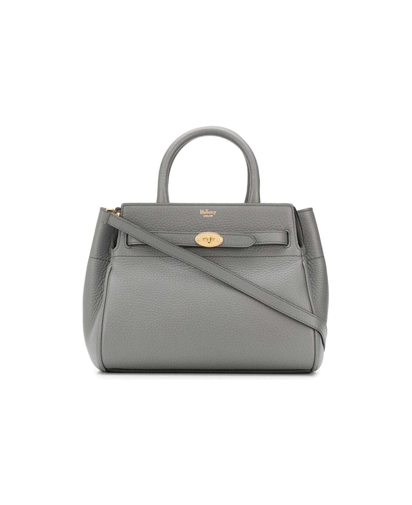 Tote bag Two top handles Single compartment Internal zip pockets Front twist lock closure Font debossed logo Detachable strap Pebbled texture Gold-tone hardware Grey Leather Dimensions: 26x20x16cm