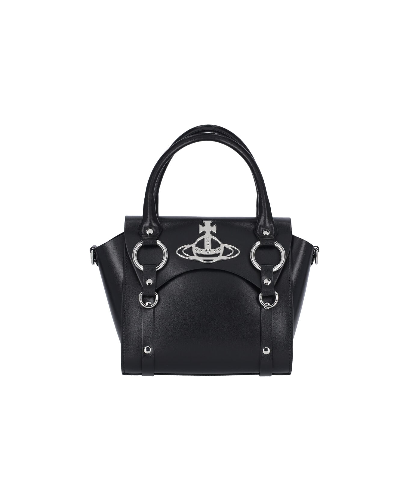 Vivienne Westwood 'Small Betty' handbag in black leather with two handles, removable shoulder strap, magnetic button flap closure, silver metal 'Orb' logo detail, inner zip pocket, main inner compartment.