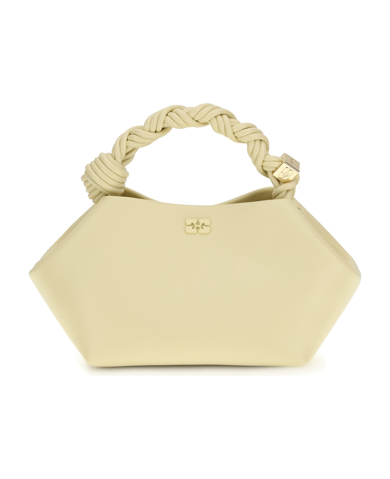 The small bou handbag by ganni, with its smooth texture, combines elegance and functionality in a compact design. featuring the tone-on-tone ganni butterfly logo and embossed logo on the back, it has a braided top handle with knot, adjustable and removable shoulder strap, and metal studs engraved with the ganni and butterfly logos. the internal magnetic closure and two internal compartments complete the bag, offering practicality and style.