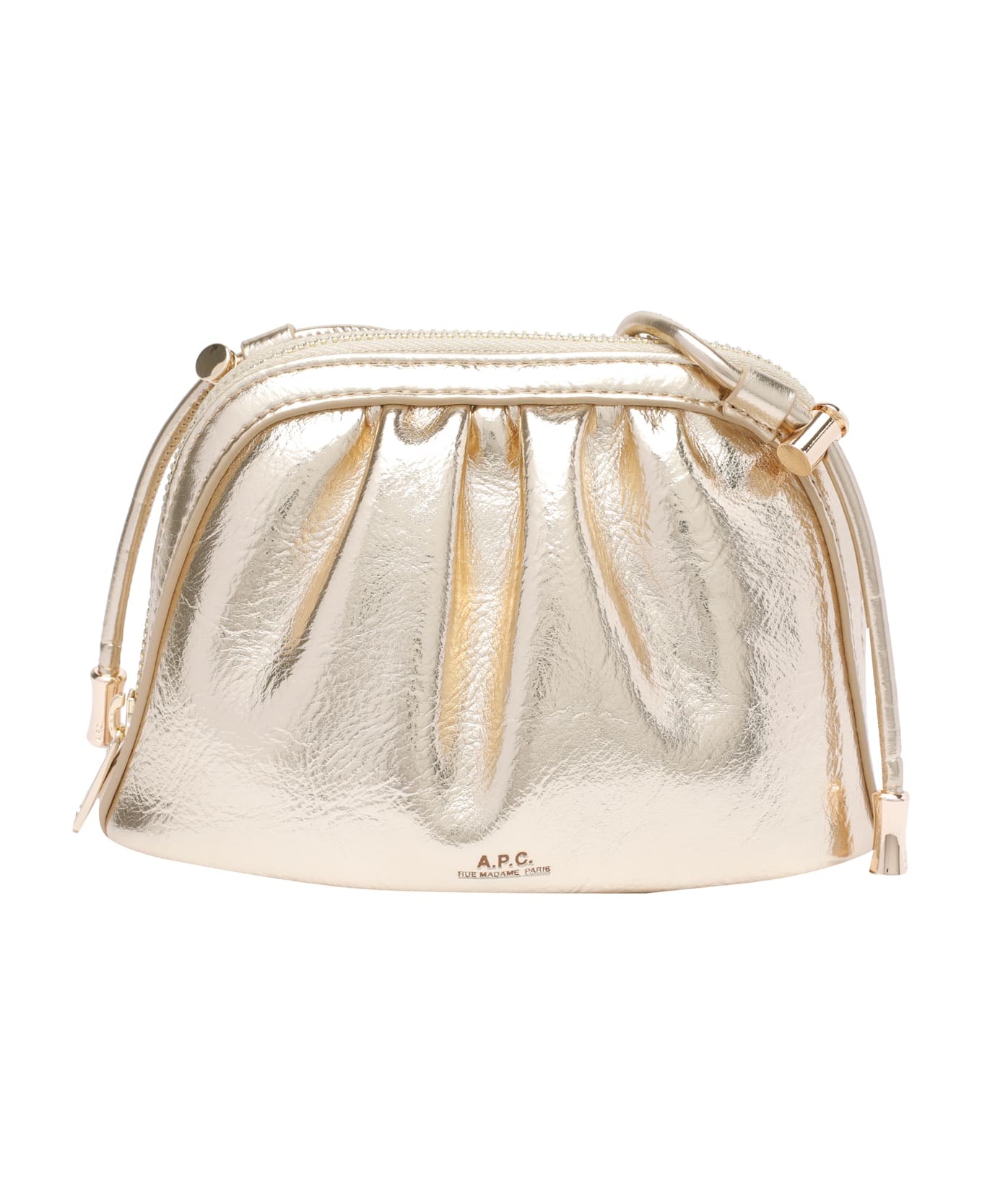A. P. C. gold drawstring Ninon shoulder bag, zip clousre, inner open pocket, adjustable shoulder strap, logo on the front Composition: 48% Polyurethane, 40% Polyester, 8% Wood Fiber, 4% Calcium