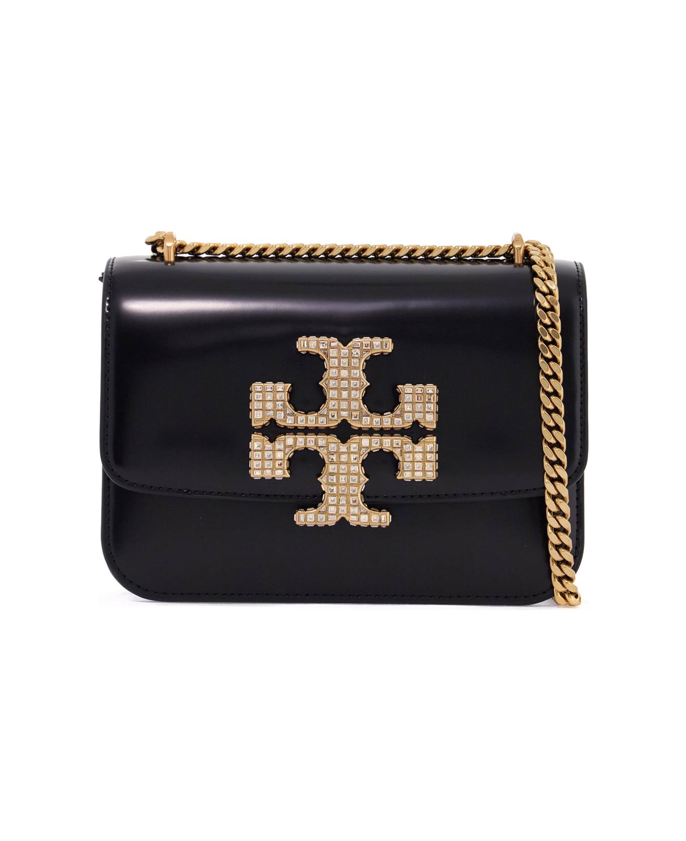 The Eleanor shoulder bag by Tory Burch is made of brushed leather with a Double T in gold metal adorned with pavé crystals applied on the flap. It features a magnetic closure, smooth leather interior with two expandable compartments and a zip pocket, and a sliding chain strap for a versatile look.