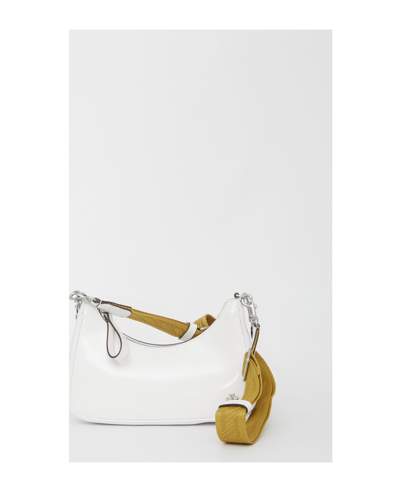 Small Mercer bag in white shiny smooth leather with silver-tone hardware. It features embossed Double T logo on the front, detachable leather top handle, one additional detachable chain handle, adjustable and detachable fabric shoulder strap, zip closure, one main interior compartment and one interior card slot.
