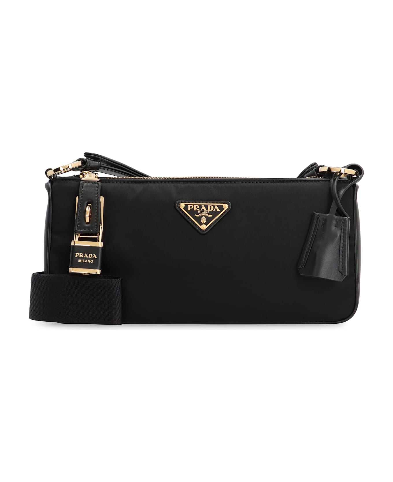 Nylon item with leather details made from recycled materials clochette with lock and key top zippered closure internal zippered pocket adjustable fabric shoulder strap gold-tone metal hardware jacquard fabric lining with logo width: 27 cm height: 13 cm depth: 4 cm strap: 110 cm 100% polyamide Composition: 100% % Polyamide
