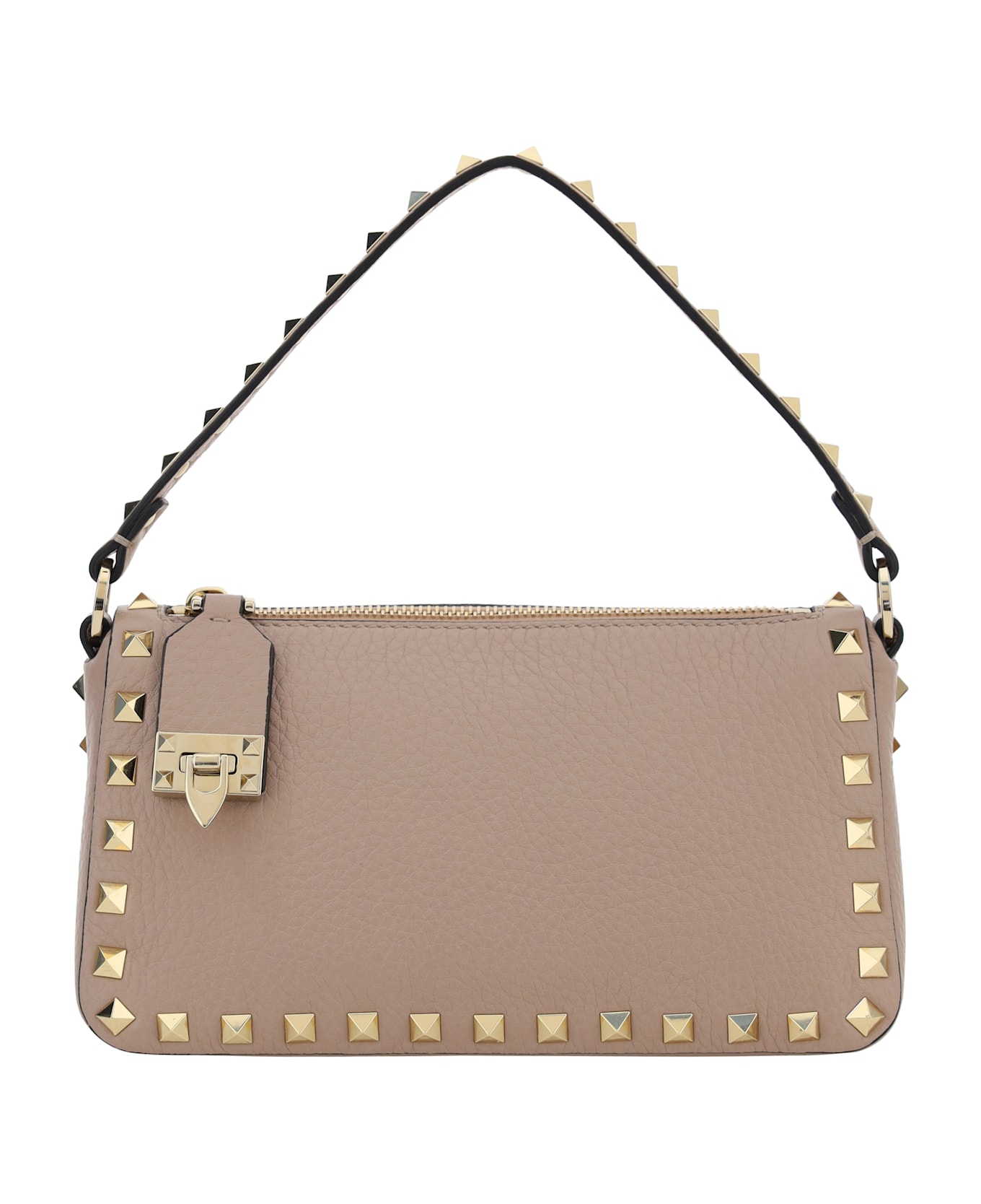 Valentino garavani's small rockstud shoulder bag is a bold and distinctive accessory that combines elegance and character. made of grained leather, the bag features studs decorating the flat handle, flat shoulder strap and profiles, giving it a rock-chic look. the zippered top closure ensures convenience and security, while a hook-and-eye adds a functional touch to the design. on the back, the brand's iconic monogram is elegantly printed, making the bag a symbol of high fashion.