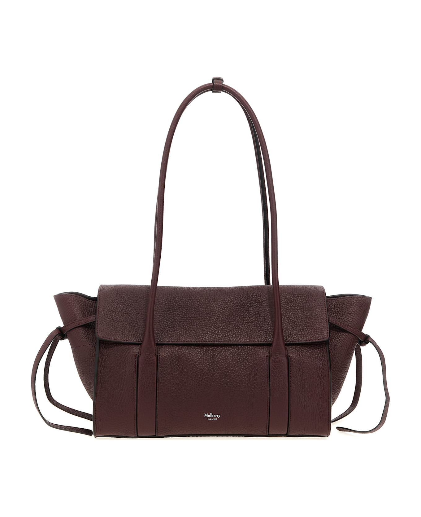 Small Soft Bayswater shoulder bag in hammered leather with front embossed logo, magnetic flap closure on the top, double fixed handle, and side tassels.