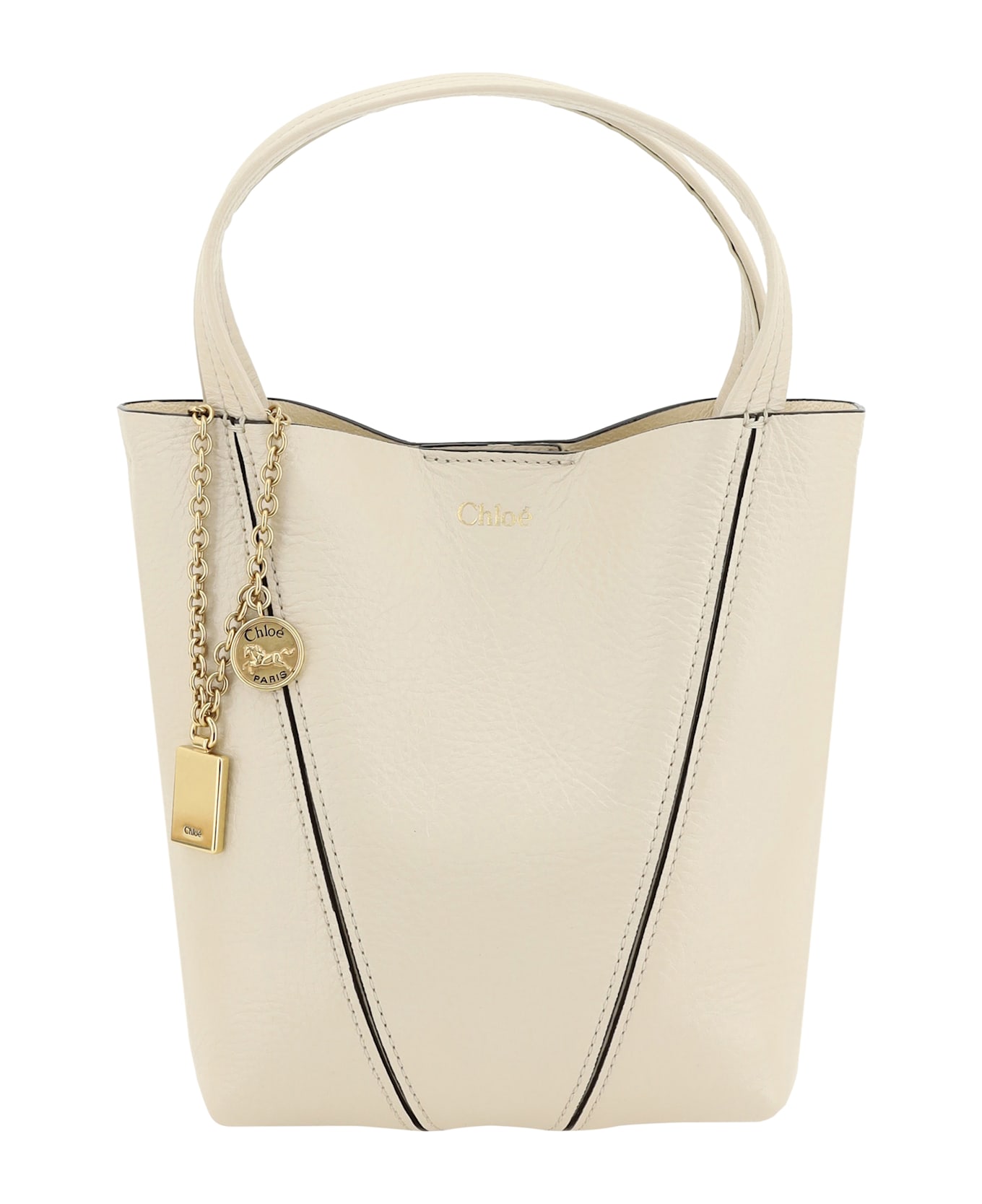 The spin shoulder bag by chloé, crafted by shiny grained leather, features an elegant design with two flat top handles and an adjustable shoulder strap. the closure is secured by a magnetic button, while the detail of the hanging chain with chloé medals and the emblematic horse adds a distinctive touch. the iconic monogram press-stamped on the front stands out, and inside there is a single compartment, for a minimalist and functional aesthetic.