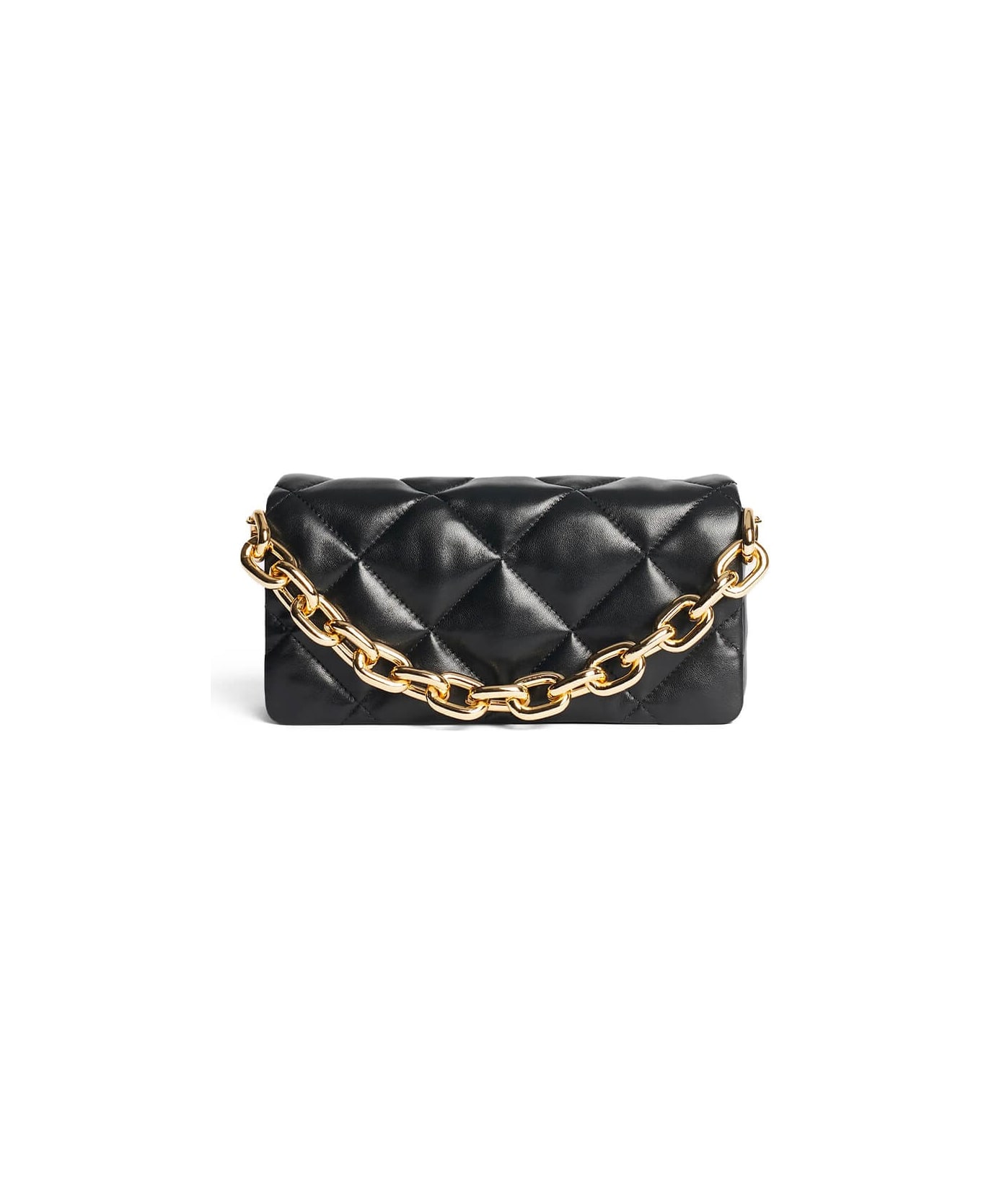 Stand Studio Hera bag made of black leather with diamond quilting, equipped with a detachable golden chain shoulder strap. Lined interior, divided into two compartments plus a zipped partition. Adjustable and removable shoulder strap in black leather, magnetic closure. Measures 25x7x12. 5 cm. Composition: 100% leather. Lining: 100% polyester.