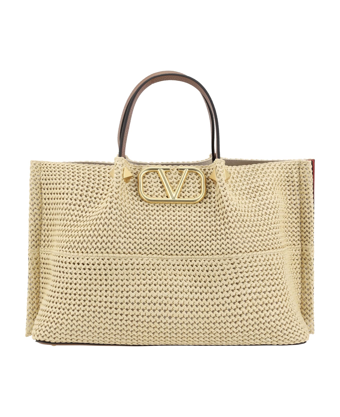 The valentino garavani straw shoulder bag is an elegant and distinctive summer accessory, combining natural materials and luxurious details. the two flat leather handles offer comfortable hand carrying, while the studded leather shoulder strap adds a bold and modern touch, in perfect contrast with the lightness of the straw. the iconic gold logo of the brand, applied on the front, completes the design with a luxurious accent, while the built-in leather pouch offers practicality and organization, allowing you to keep essentials separate.