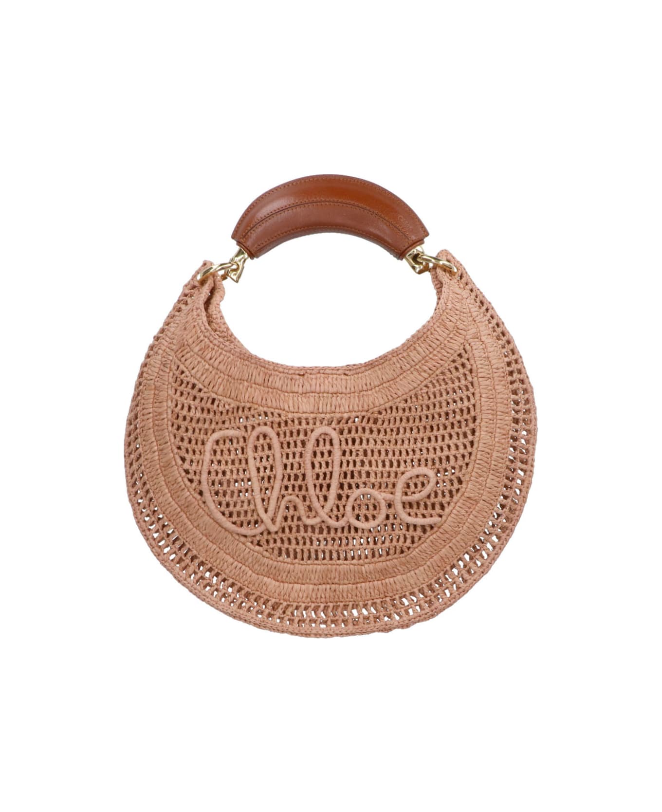 Chloé Summer Banana hobo bag in beige raffia with leather trim, woven pattern, handle, magnetic closure, maxi tone-on-tone logo embroidery on the front, inner flat pocket, main inner compartment. Composition: 100% Raffia
