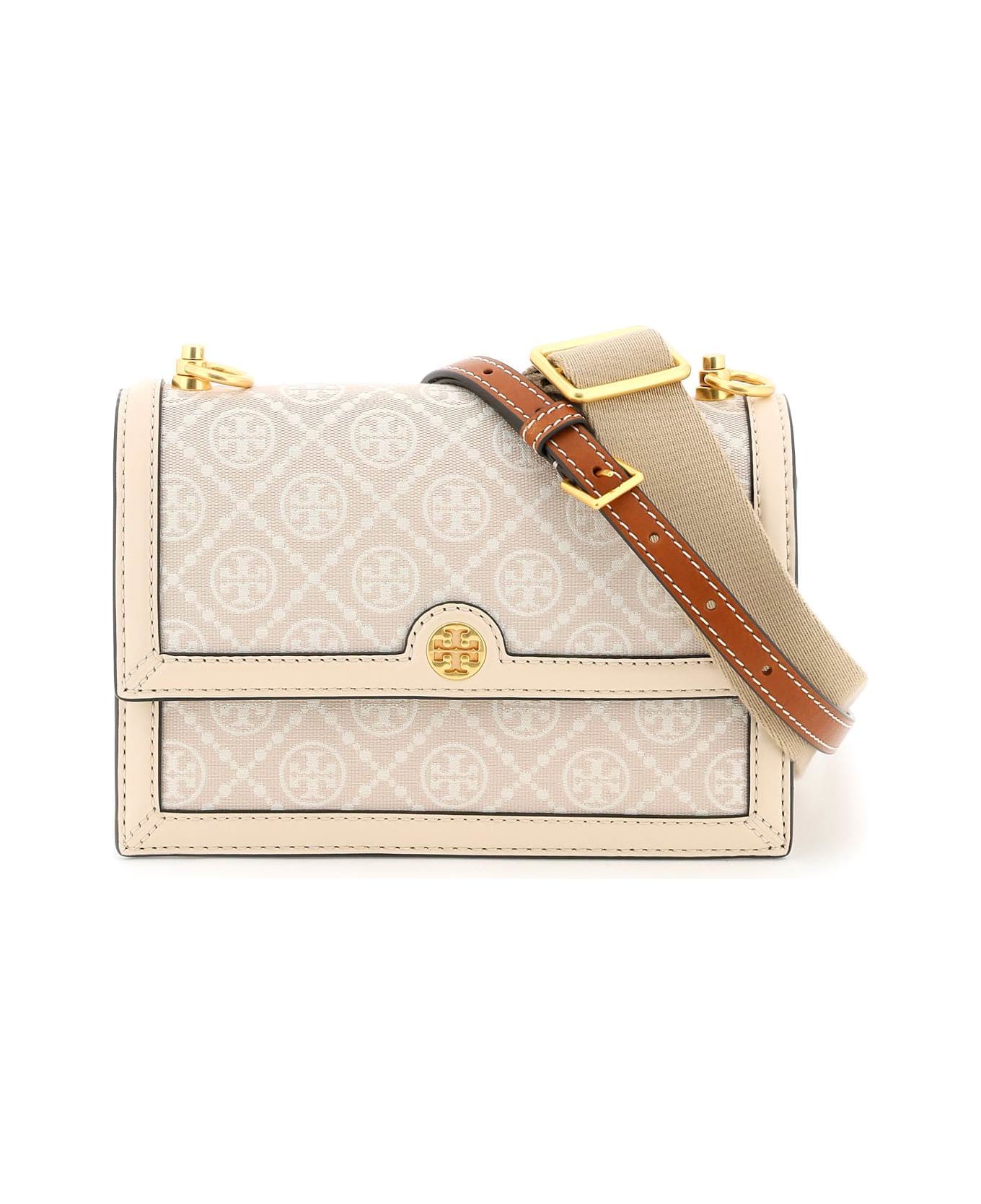 Tory Burch shoulder bag crafted in cotton-blend canvas with contrasting jacquard T Monogram motif. Leather trim, magnetic closure with metal Double T on flap, smooth leather interior with three gusseted compartments, a central zippered pocket and two slip pockets. Adjustable and detachable shoulder straps and gold-finished metalware.